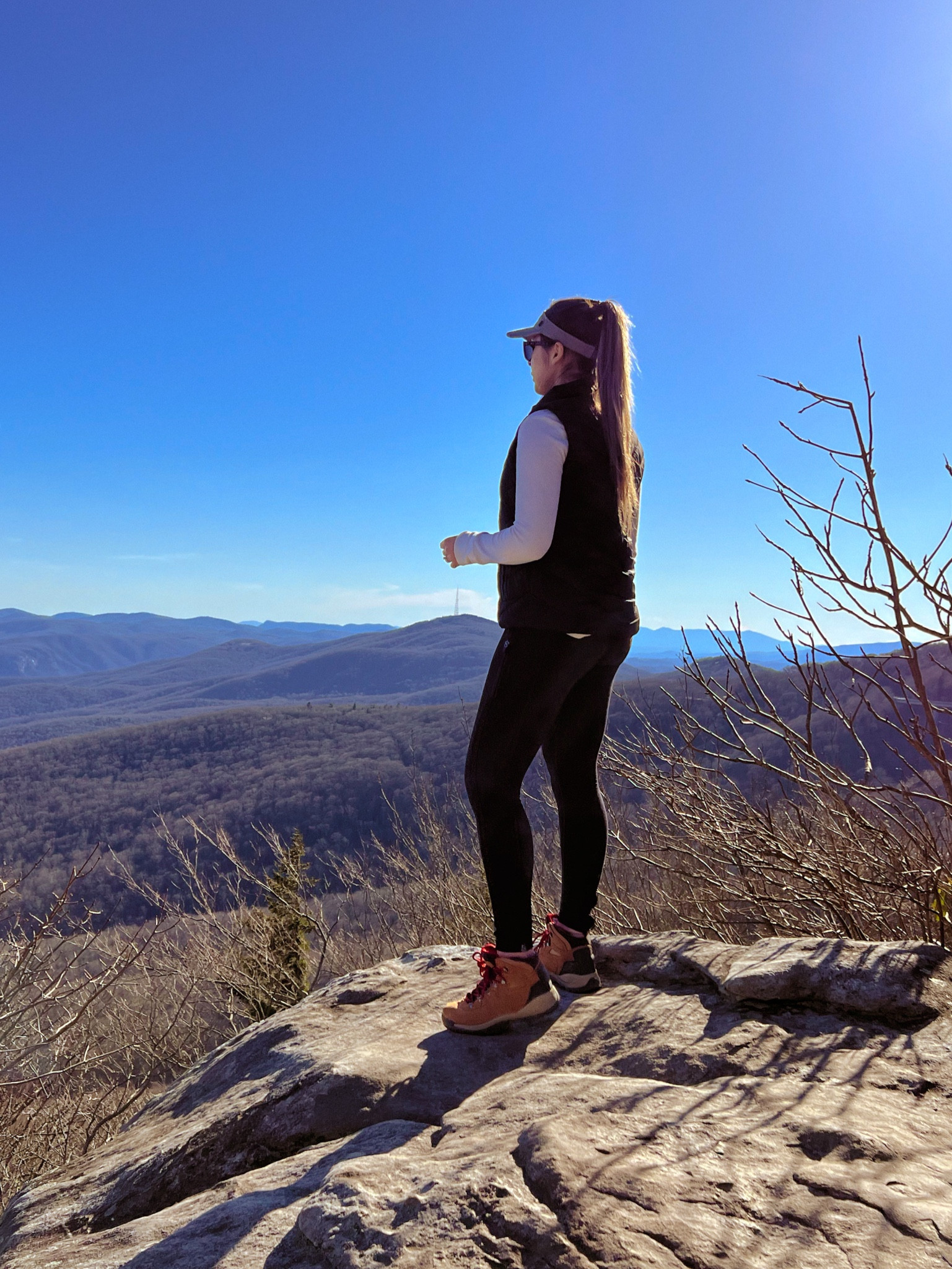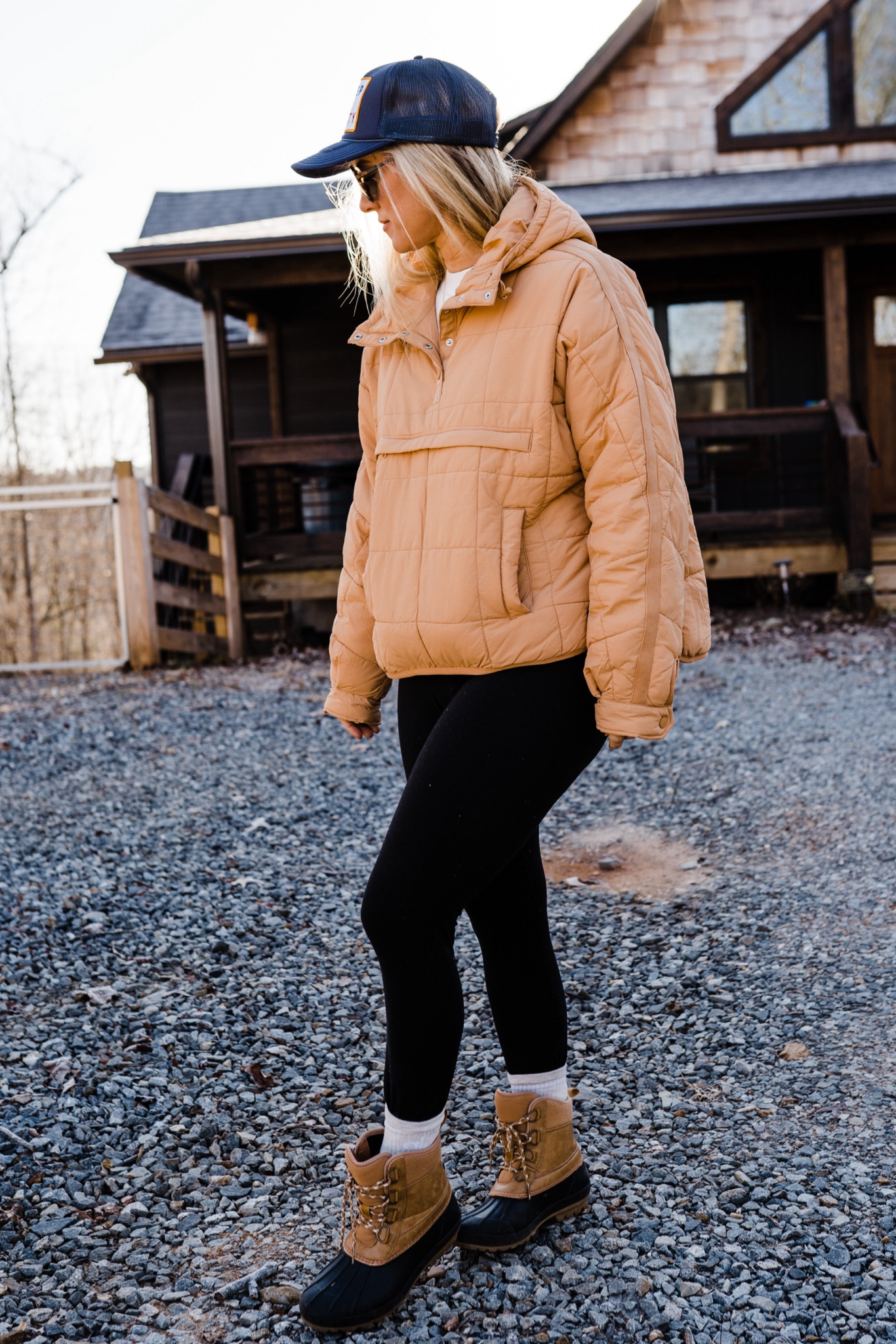 The puffer jacket provides a pop of color and cozy functionality, perfect for the outdoor setting, while the leggings and hiking boots suggest practicality and comfort for an active day in nature. The beanie is a stylish yet sensible touch that ties the ensemble together and ensures warmth.