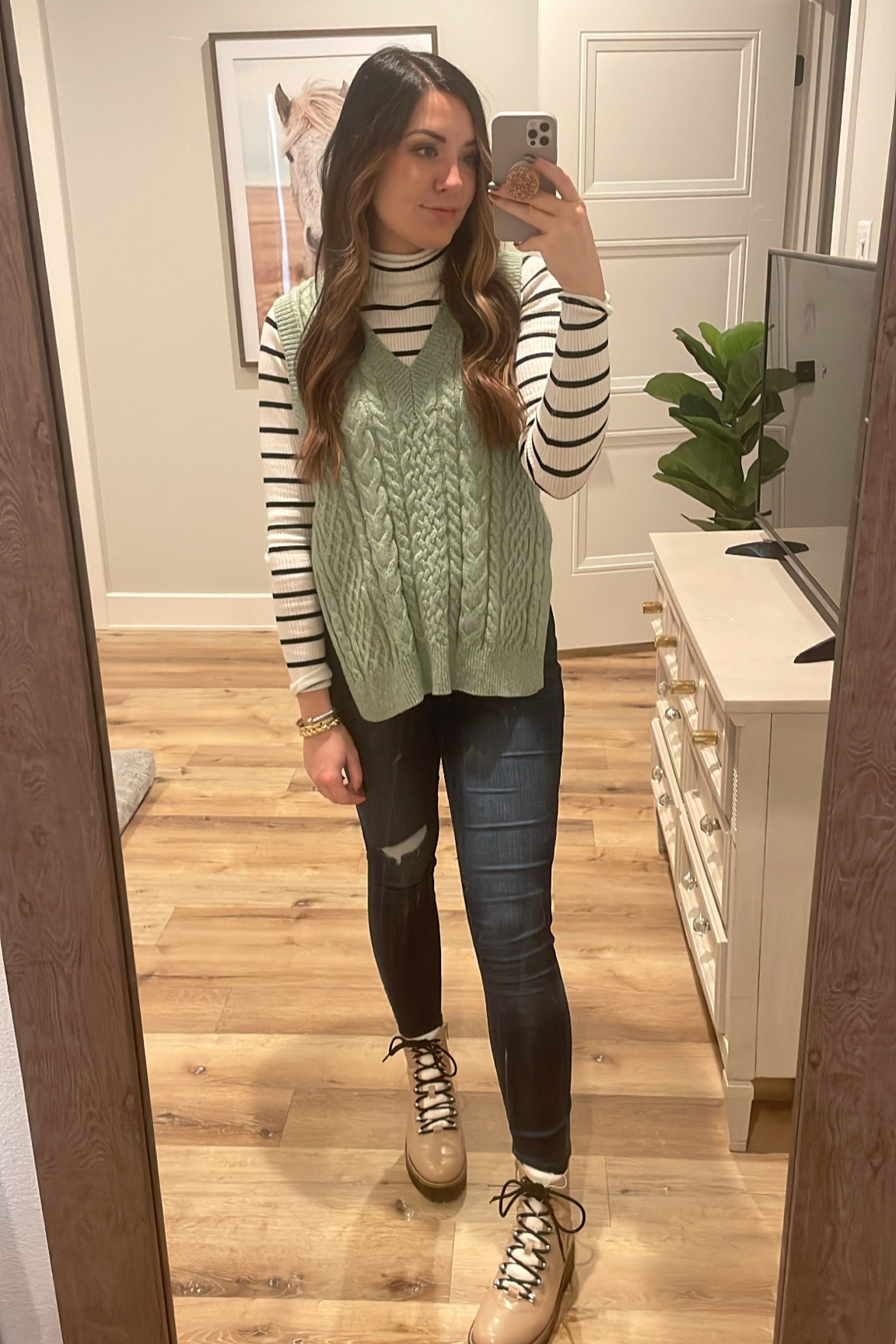 The layered look with the striped turtleneck under a textured knit vest introduces a delightful play of patterns and textures, creating visual interest. Additionally, the slim-fitting jeans and chunky boots balance the outfit by adding a trendy, casual edge.