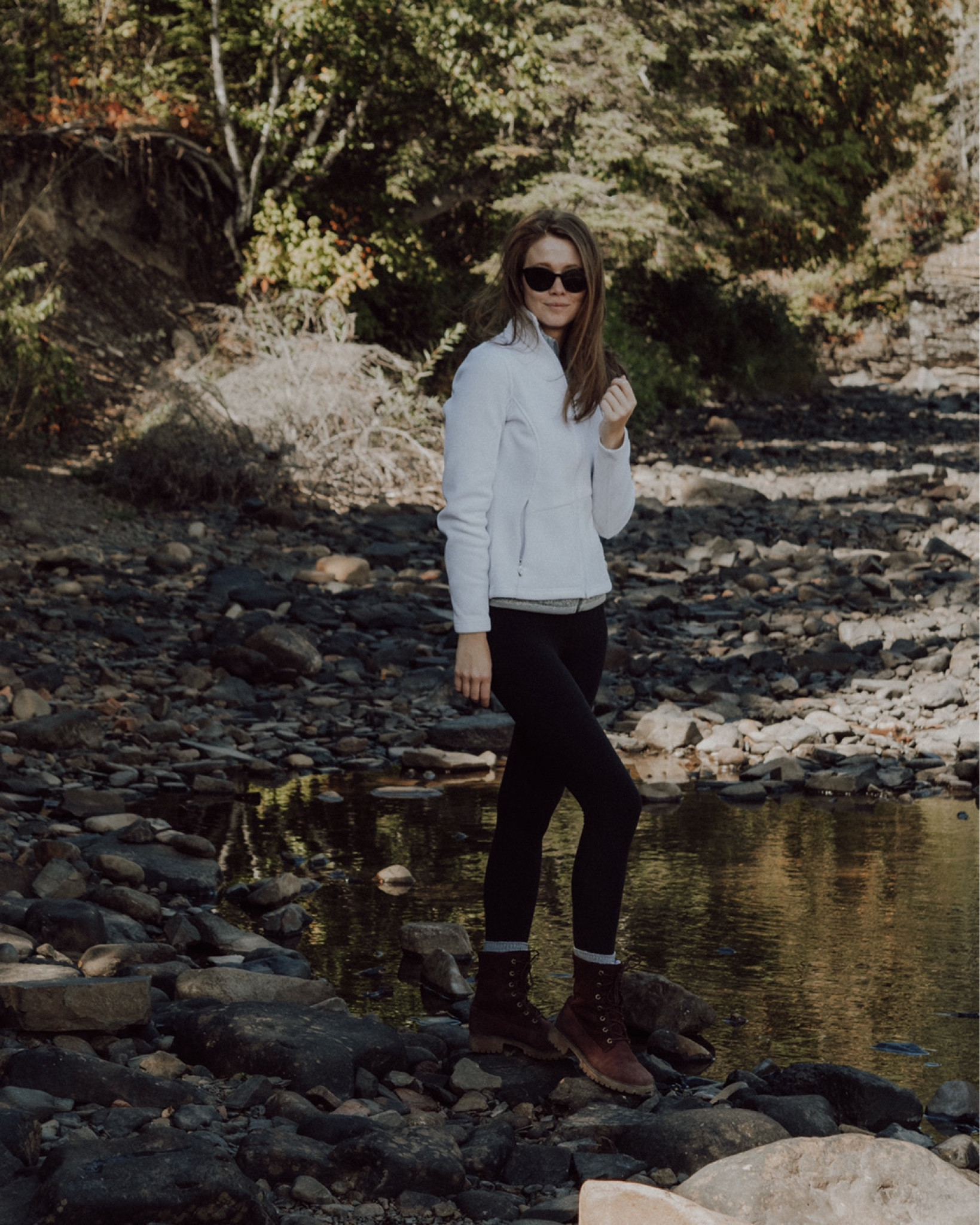 This ensemble offers a casual yet stylish outdoor look; the white hoodie provides a fresh contrast against the natural backdrop, while the black leggings and brown boots suggest practicality and comfort for an active day out. The matching of simple, versatile pieces creates an effortlessly chic aesthetic that works harmoniously with the setting.