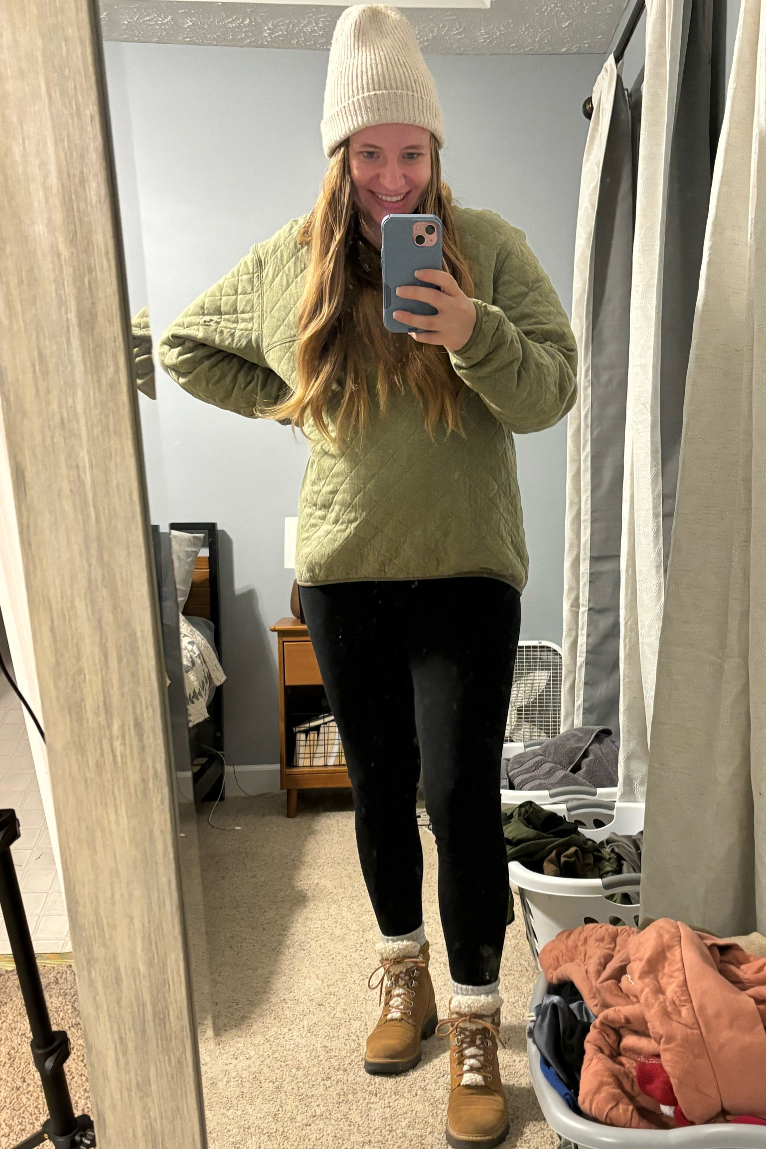 The quilted jacket exudes a cozy yet stylish aesthetic, paired well with sleek black leggings that offer a streamlined contrast, and the beanie adds a playful, wintry touch. The choice of earthy-toned, sturdy boots grounds the look, highlighting a perfect balance of fashion and function for cooler weather.