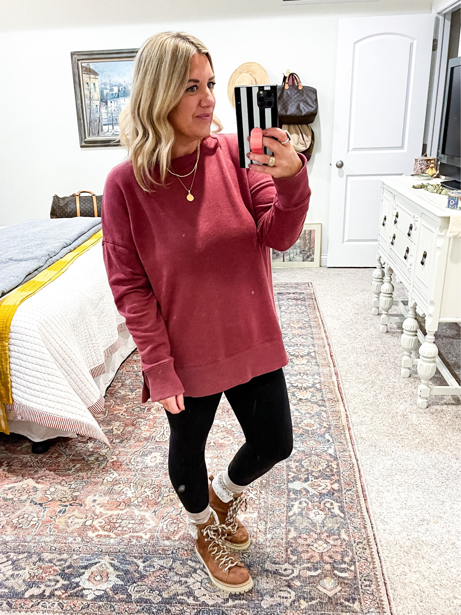 The soft, pastel hue of the oversized sweater adds a cozy yet chic touch to the ensemble, while the fitted leggings create a sleek silhouette that enhances the casual yet stylish vibe. The contrasting rugged boots lend an edgy, fashionable twist to the overall look, balancing comfort with a dash of boldness.
