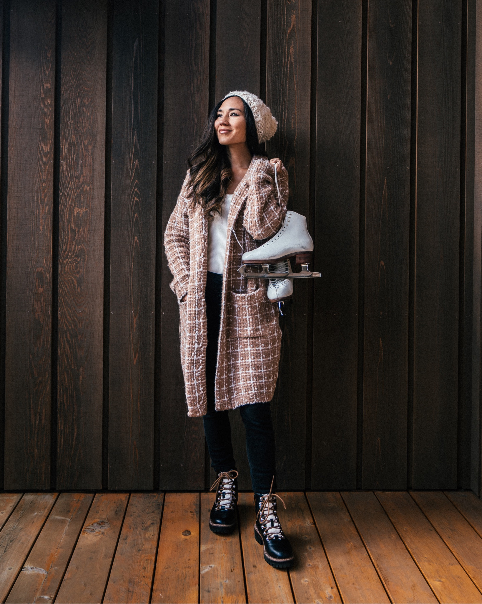 The ensemble’s earthy tones harmonize beautifully with the natural setting, and the practical layering provides both warmth and a stylishly casual aesthetic perfect for a winter’s day outdoors. The classic lace-up boots add a chic touch while ensuring functionality for the snowy terrain.