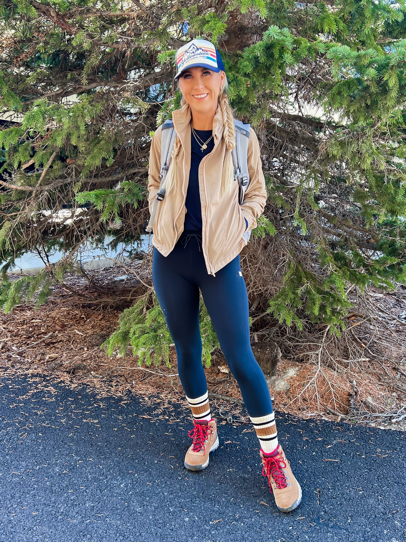 The blend of functional and stylish elements in this ensemble is striking—the layering of the vest over a long-sleeved top is practical yet fashionable, and the choice of rugged boots with brightly colored laces adds a playful touch to an otherwise neutral palette. The complementary balance between the casual, form-fitting leggings and the more structured vest and cap creates a cohesive and versatile look perfect for an active day outdoors.