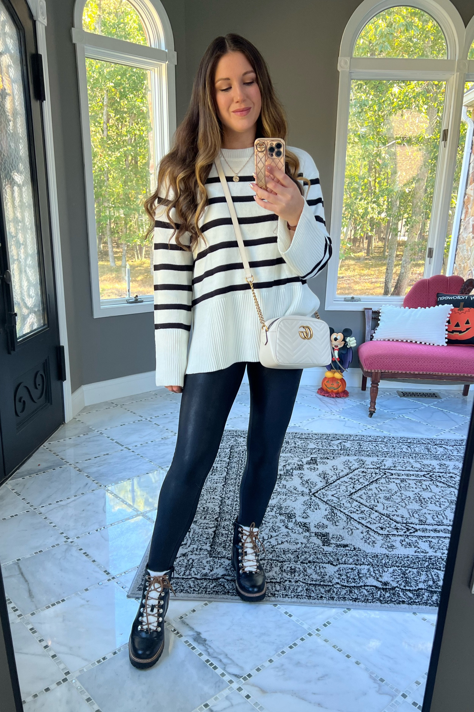 The classic black and white striped sweater offers a timeless, chic look that’s elevated by the pairing with sleek black leggings, allowing for a harmonious blend of comfort and style. The outfit is smartly accessorized with a crisp white crossbody bag and lace-up boots, adding a touch of edginess and coherence to the ensemble.