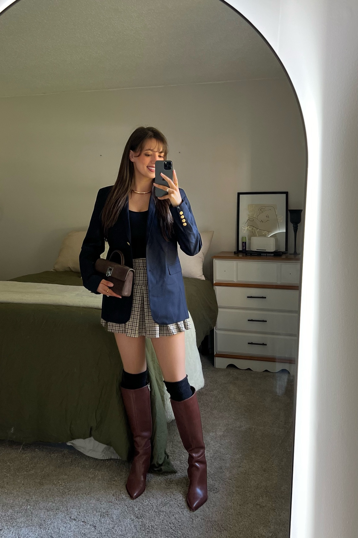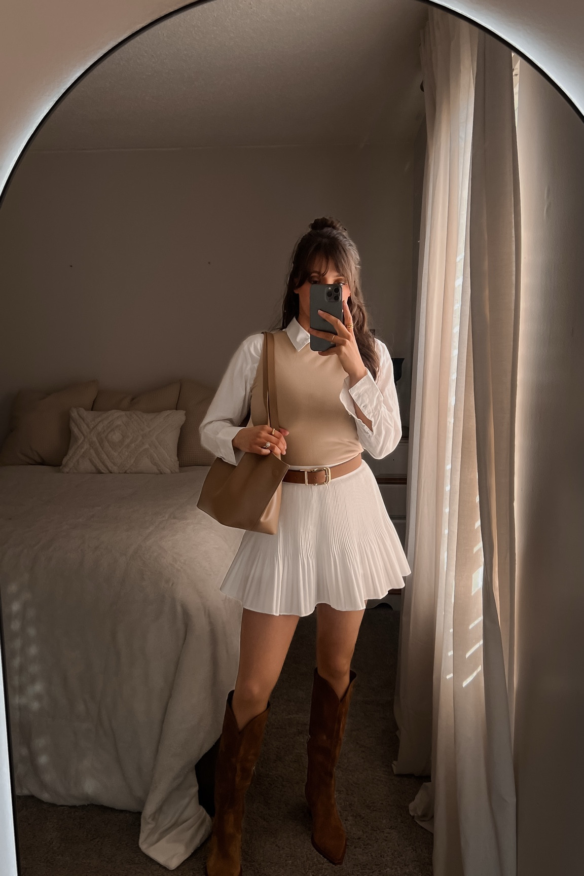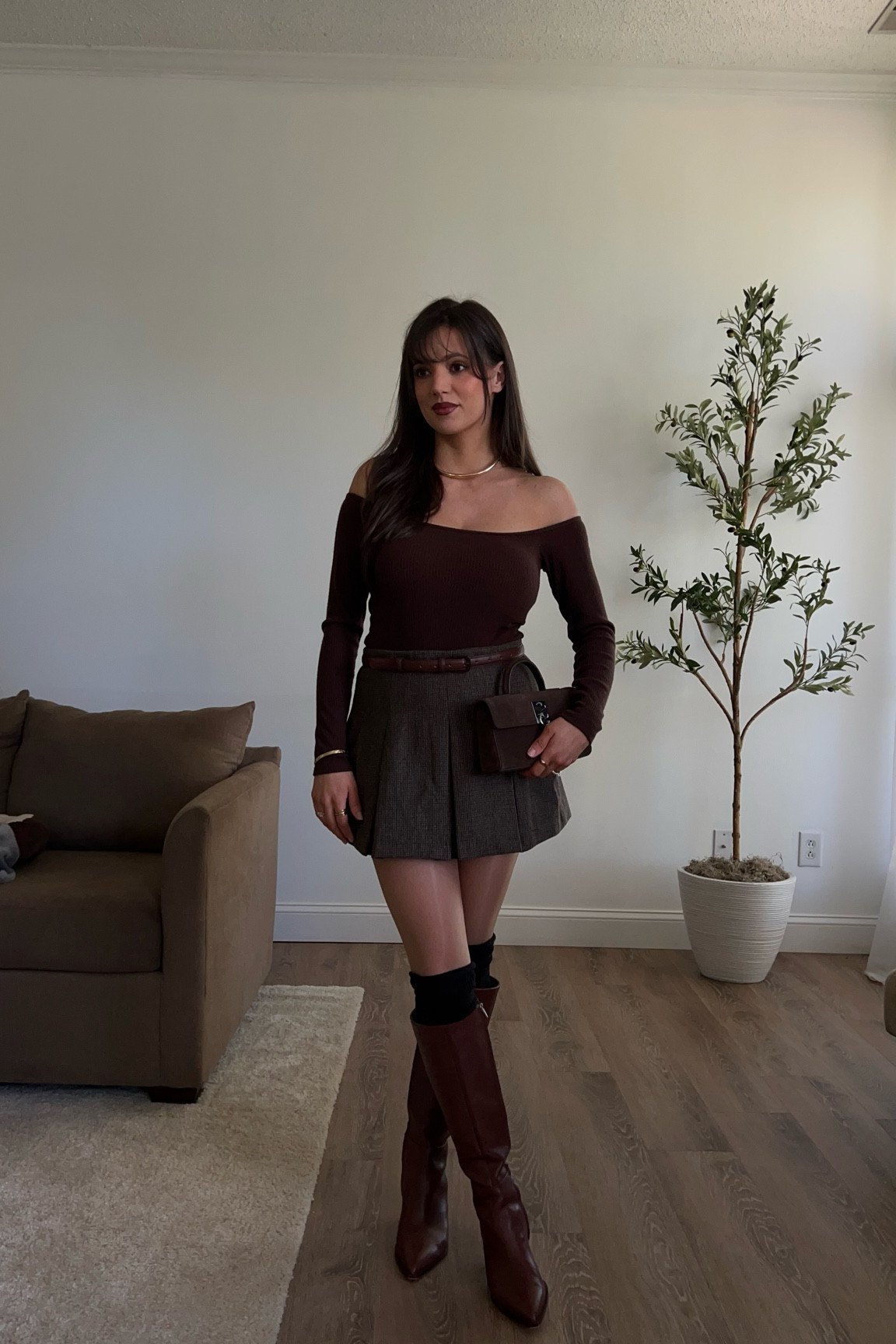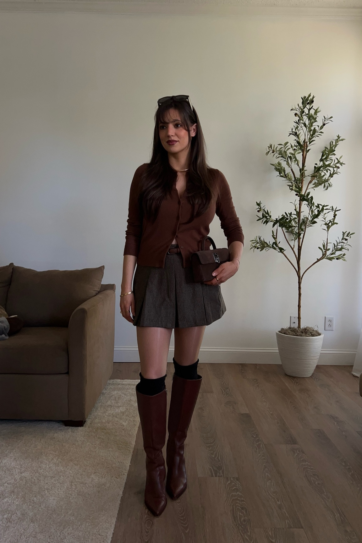 – The pleated skirt and the brown knee-high boots create a nice contrast and elongate the legs.