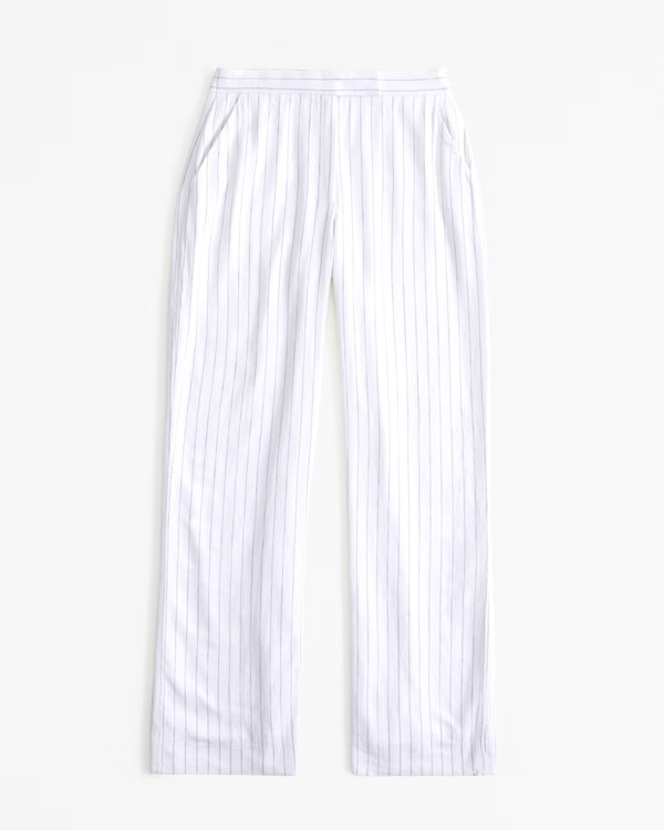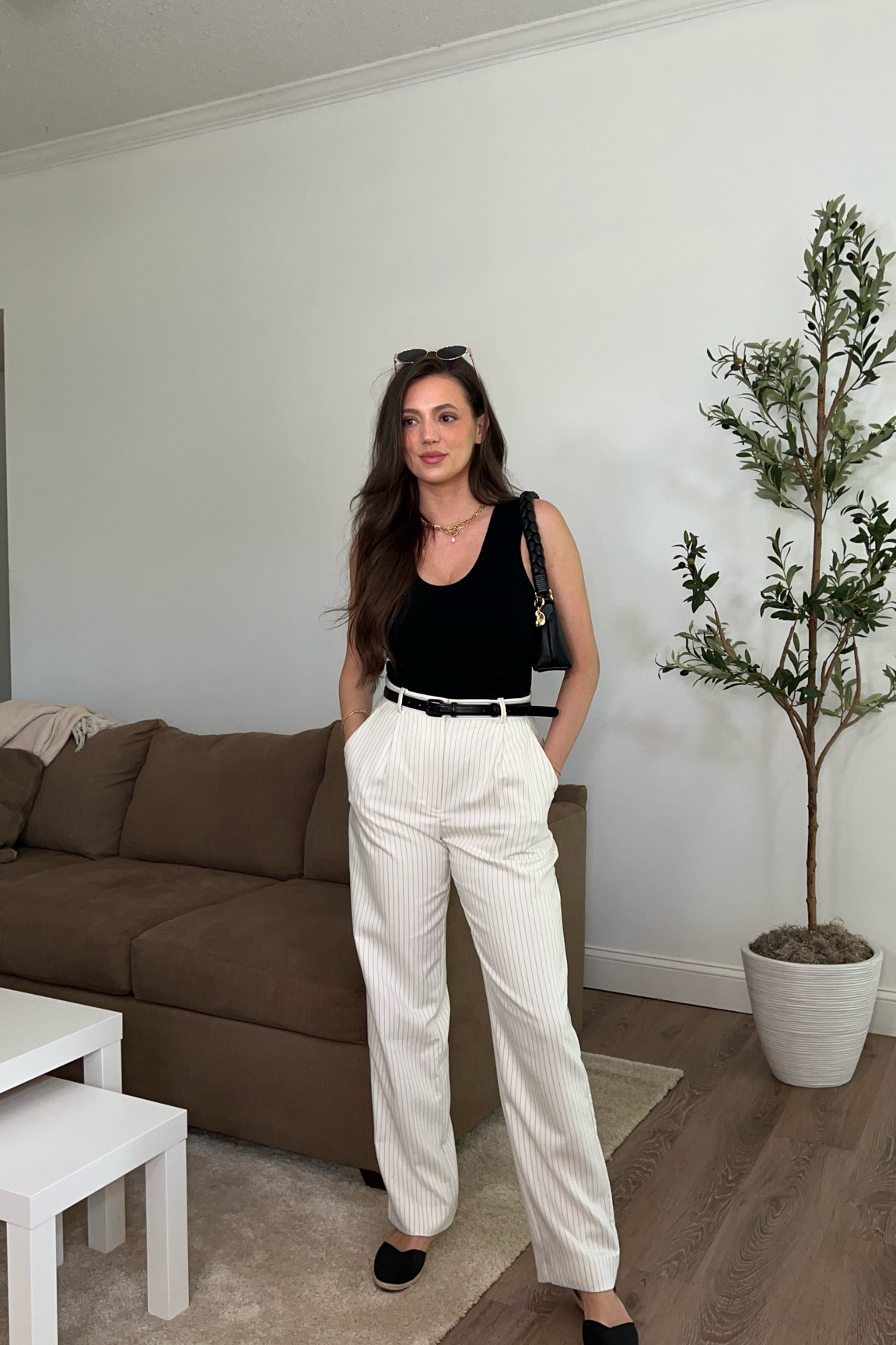 – I love how the black top adds a sleek contrast to the white striped pants.