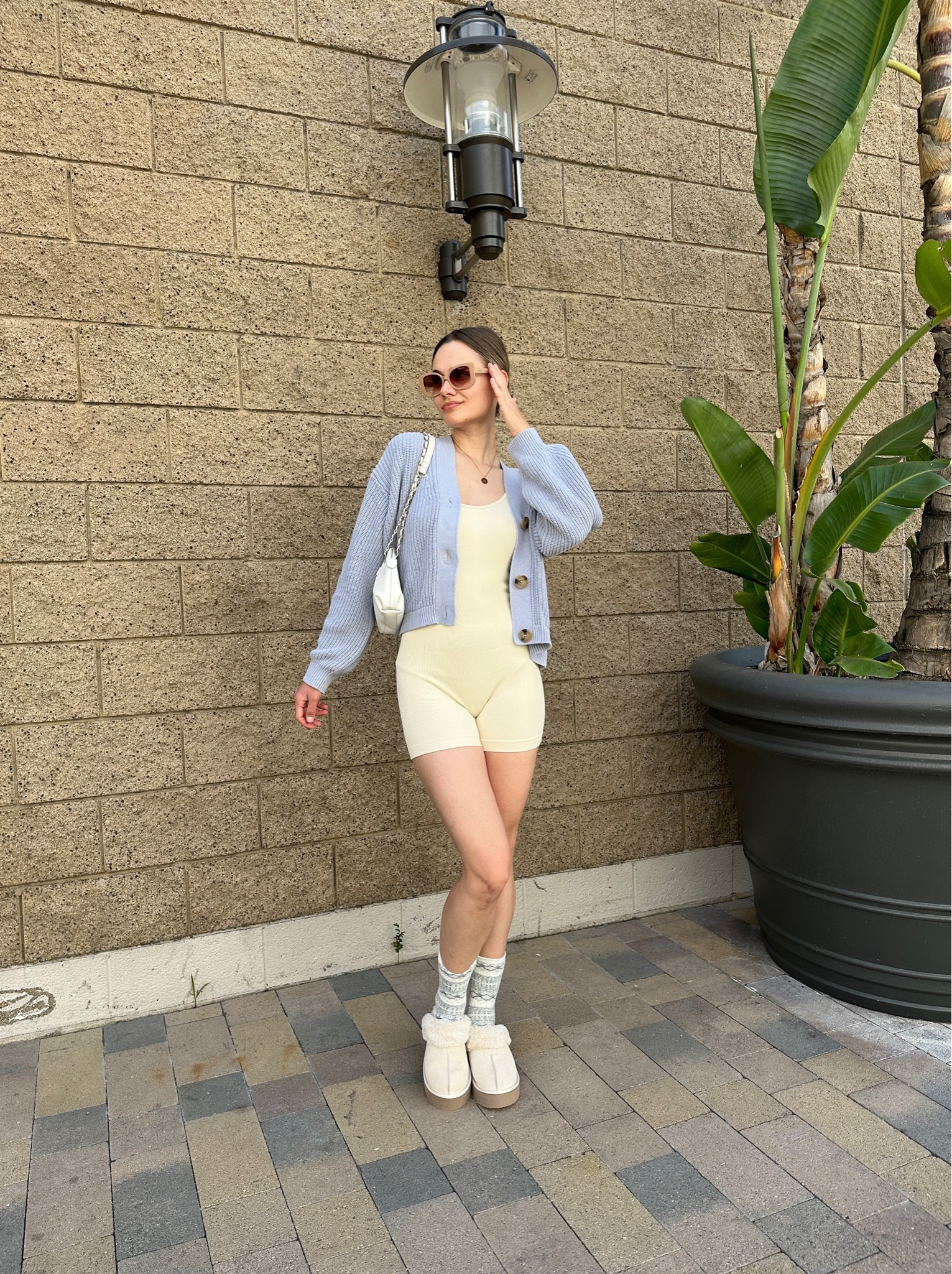The outfit offers a harmonious blend of casual and chic aesthetics with a well-coordinated color palette of neutrals that are versatile for multiple occasions. The textured cardigan and sneakers add a comfortable, relaxed dimension, while the fitted bodysuit and skirt create a sleek, feminine silhouette.