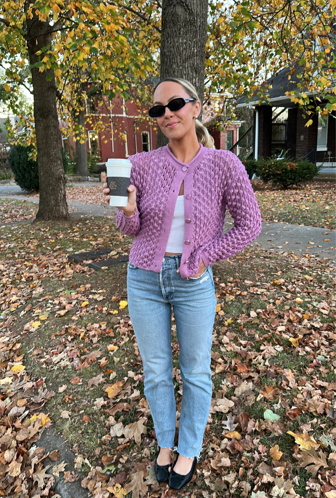 The bold purple crochet cardigan adds a playful yet sophisticated layer of texture and color that contrasts nicely with the classic simplicity of the light-wash straight-leg jeans, creating a balanced ensemble that’s both stylish and comfortable. The choice of minimalistic accessories, such as the sleek sunglasses and black flats, complements the outfit without overwhelming it, allowing the cardigan to stand as the statement piece.