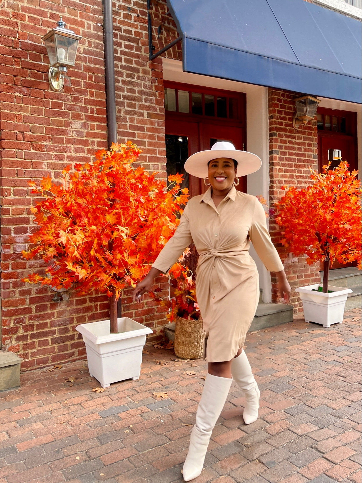 The outfit pairs a chic neutral-toned dress with a flattering cinched waist, creating a streamlined silhouette, while the wide-brimmed hat and matching knee-high boots add a touch of elegance and coherence to the overall look, perfectly complementing the autumnal background.