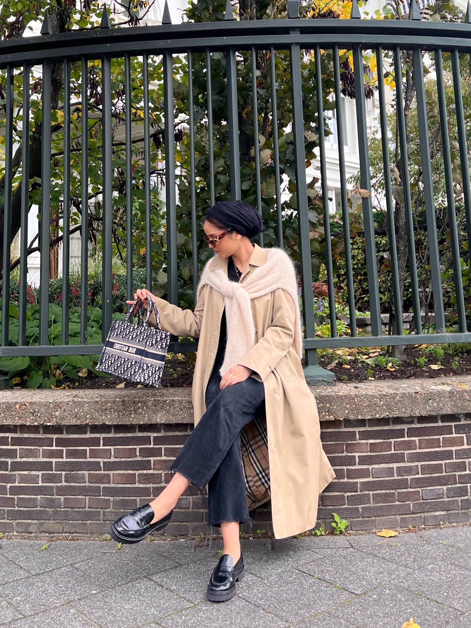 The ensemble showcases a harmonious blend of classic and contemporary styles, with the timeless elegance of the trench coat paired with chic, cropped jeans. The layering of neutral tones adds to the sophistication, while the bold footwear and stylish headwrap provide a modern, eclectic twist.