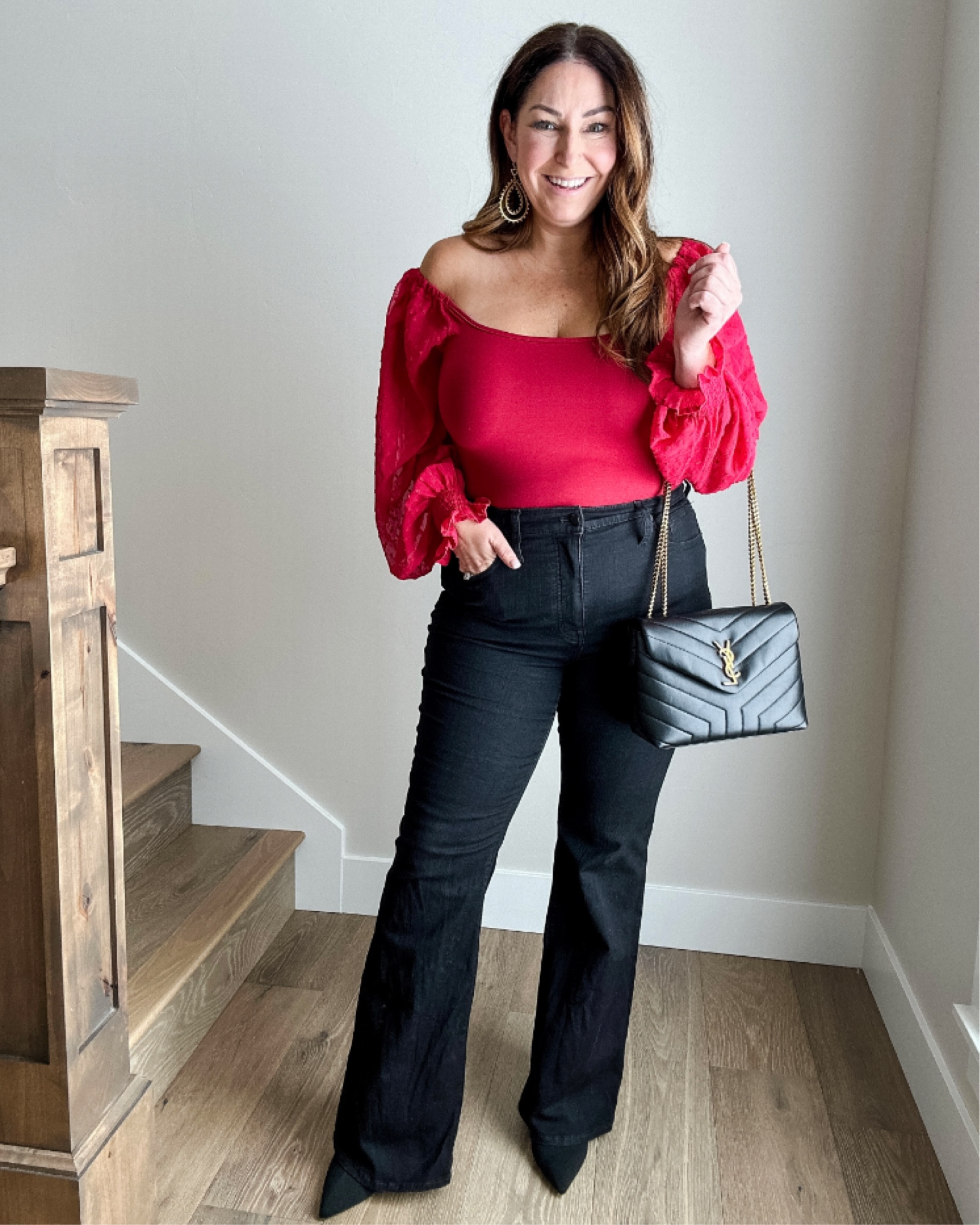 The outfit features a beautiful contrast between the bold red off-the-shoulder top, which adds a pop of color and a touch of romantic elegance, and the high-waisted black jeans that create a flattering silhouette. The choice of a simple yet chic black shoulder bag complements the ensemble without overwhelming it, maintaining a balanced and cohesive look.