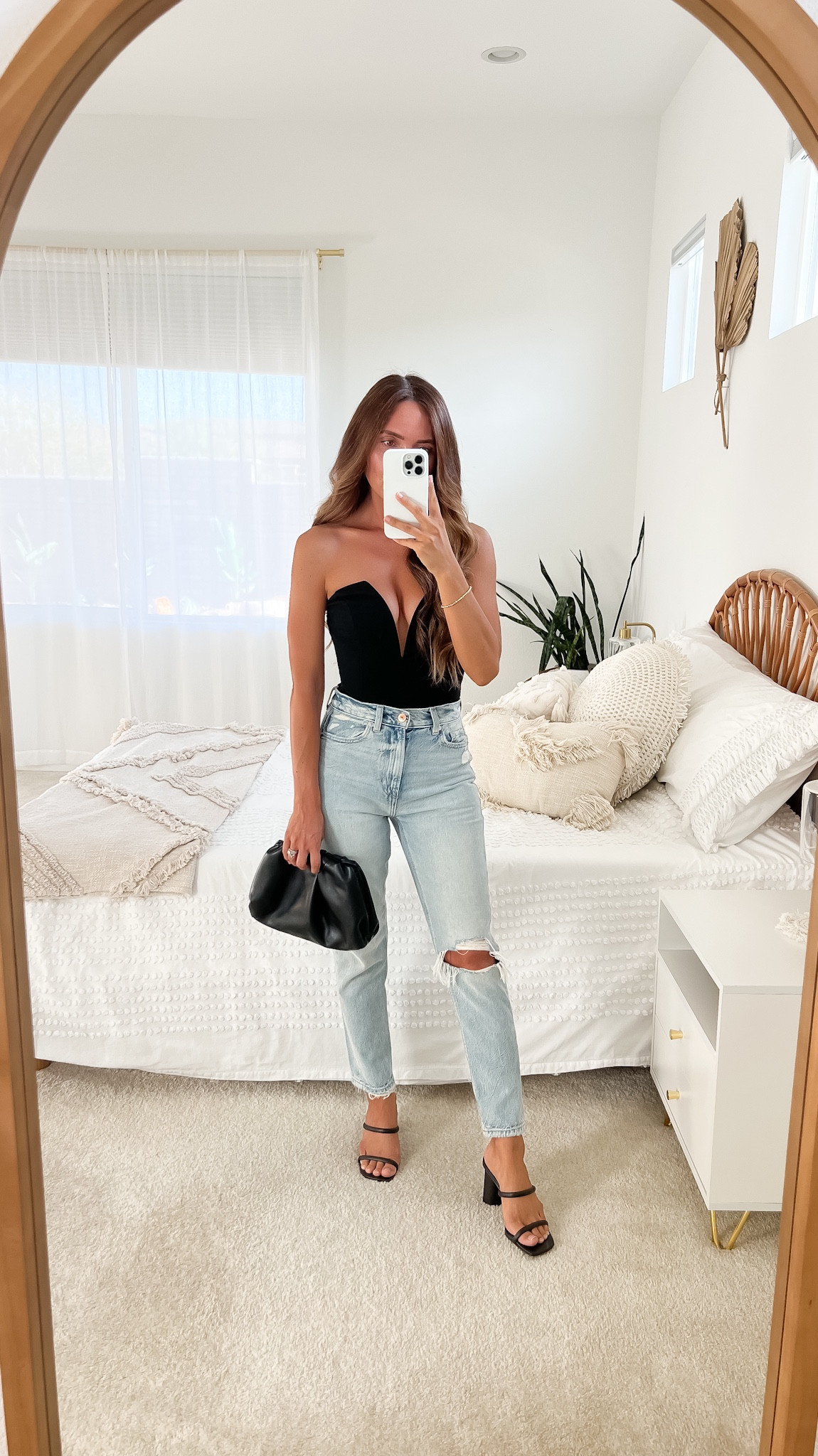 This outfit masterfully balances elegance and casual style; the black top with its sophisticated cut pairs perfectly with the relaxed fit of the distressed jeans. The ensemble is polished off with strappy heels and a classic handbag, creating a chic and versatile look.