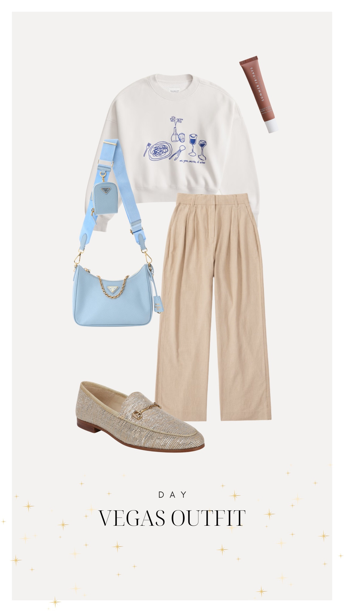 The outfit presents a refined and comfortable “day in Vegas” look with a playful, yet sophisticated color palette blending a pastel blue bag and a crisp, white top with graphic elements for a casual chic vibe. The beige trousers offer a relaxed fit essential for daytime exploring, while the metallic shoes add a touch of glam suitable for Vegas, balancing comfort with style.