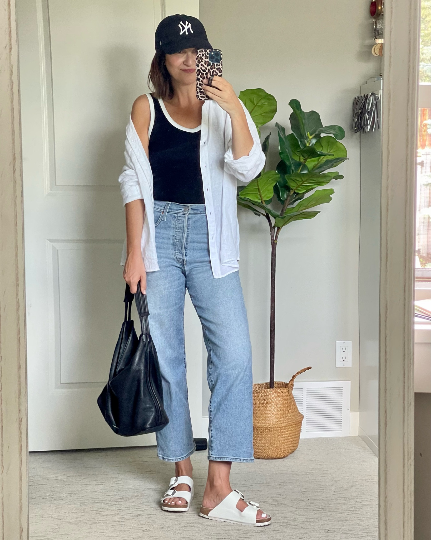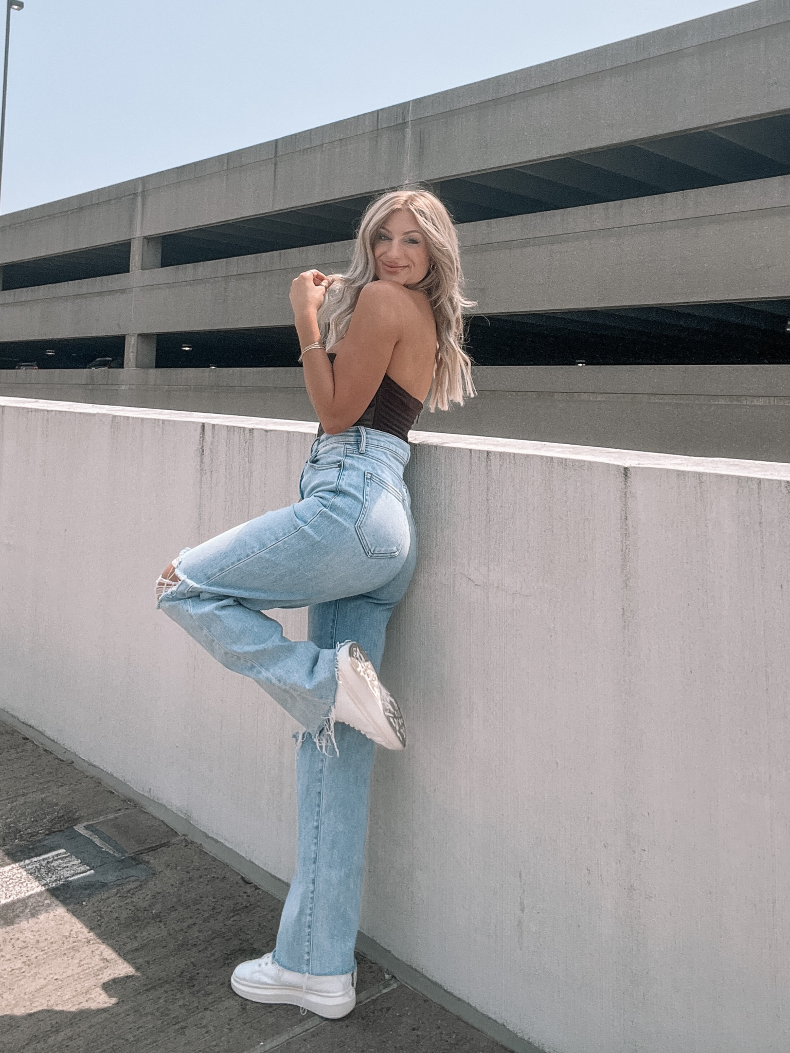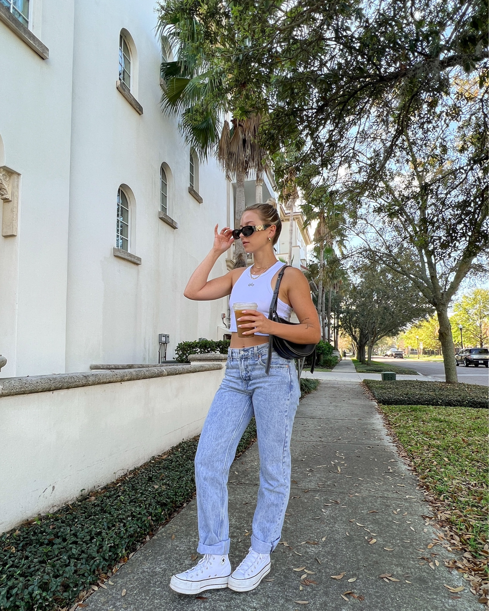 The high-waisted, acid-wash jeans paired with a classic white tank top create an effortlessly cool vibe that’s both timeless and on-trend. The choice of white sneakers adds a comfortable yet stylish touch, perfect for a casual day out.