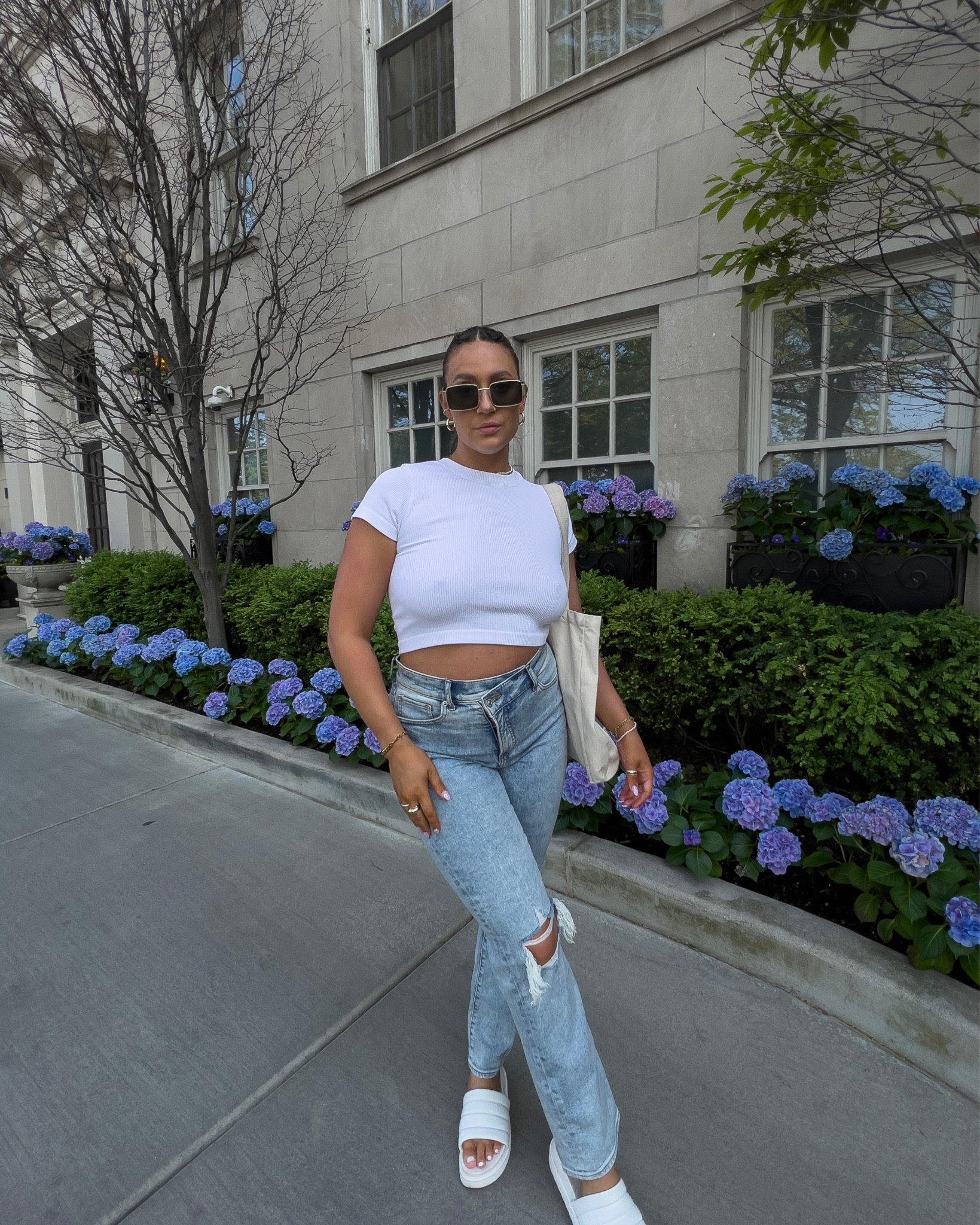 The high-waisted jeans and cropped white top combination creates an effortlessly chic and balanced silhouette, while the minimalistic color palette provides a versatile and timeless appeal. The ensemble is accessorized perfectly with understated jewelry and trendy eyewear, adding a sophisticated touch to a casual look.