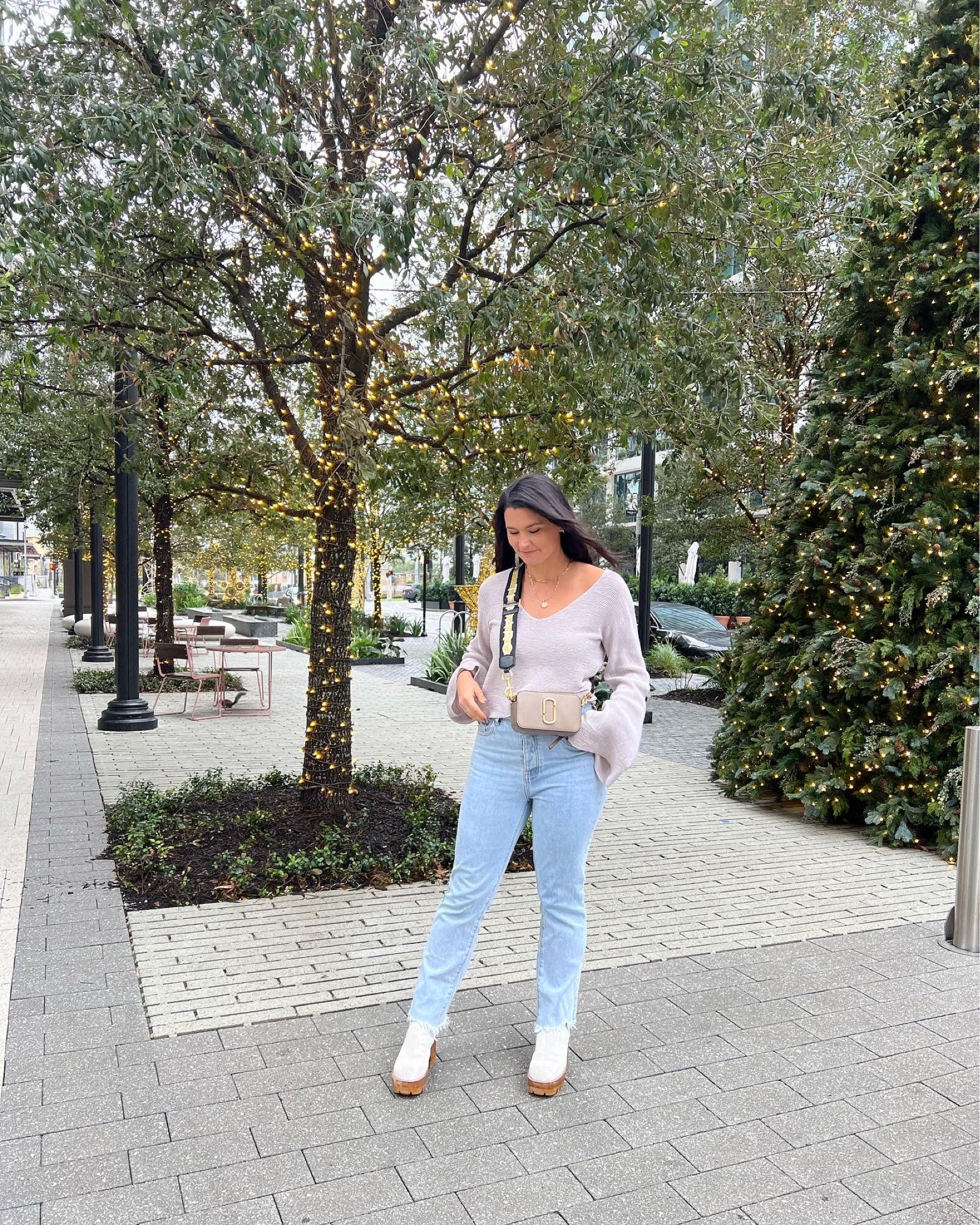 As a fashion expert, I appreciate the outfit’s effortless chic vibe, with its cozy oversized sweater adding a casual yet sophisticated touch. The high-waisted jeans accentuate the silhouette, while the light-colored booties and statement handbag perfectly accessorize and elevate the ensemble.