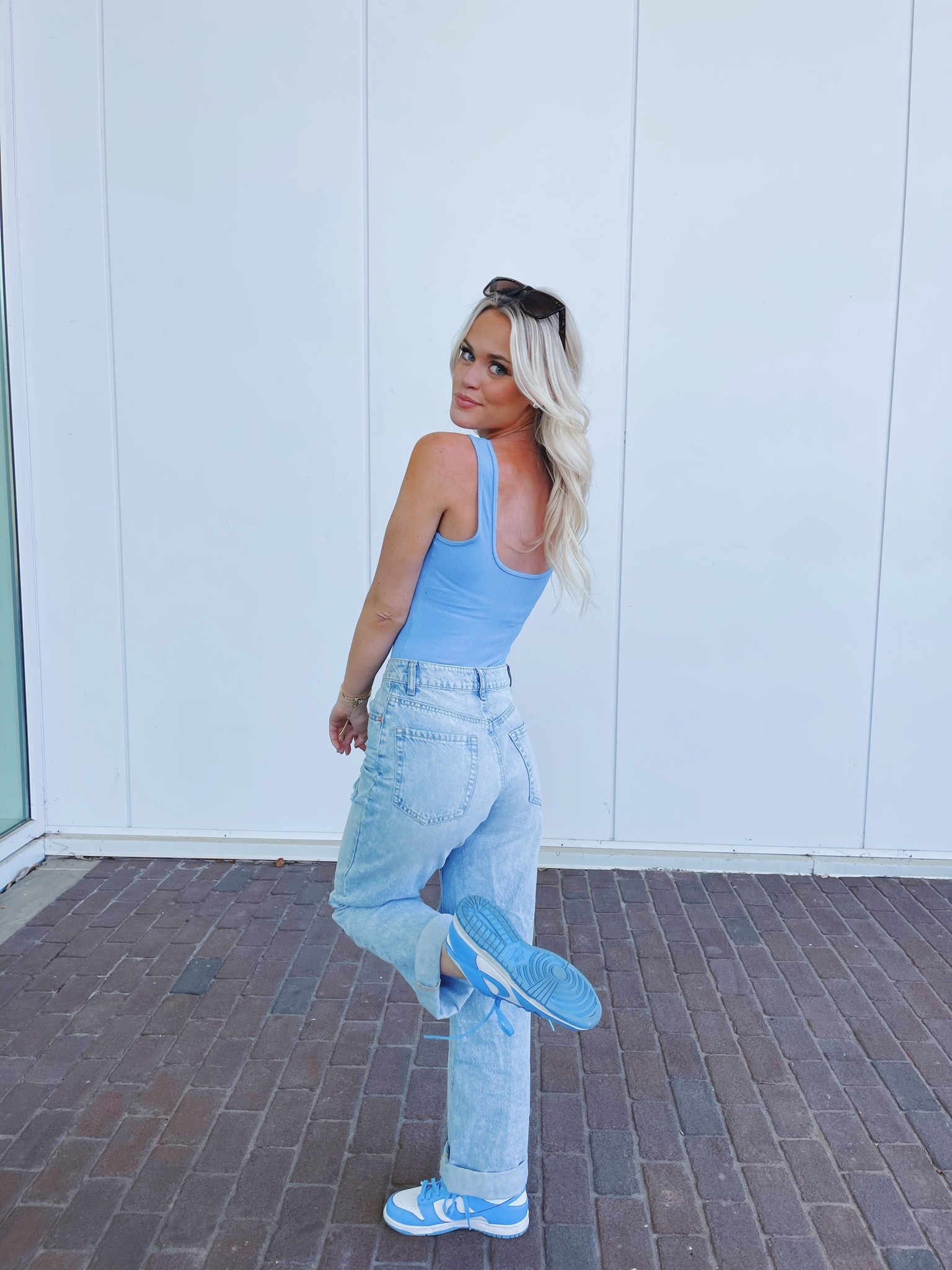 This outfit exudes a relaxed yet trendy vibe with its seamless blend of classic denim and a pop of pastel, perfectly balancing comfort and style. The high-waisted jeans accentuate the silhouette, while the matching sneakers tie the look together, adding a playful touch to the ensemble.