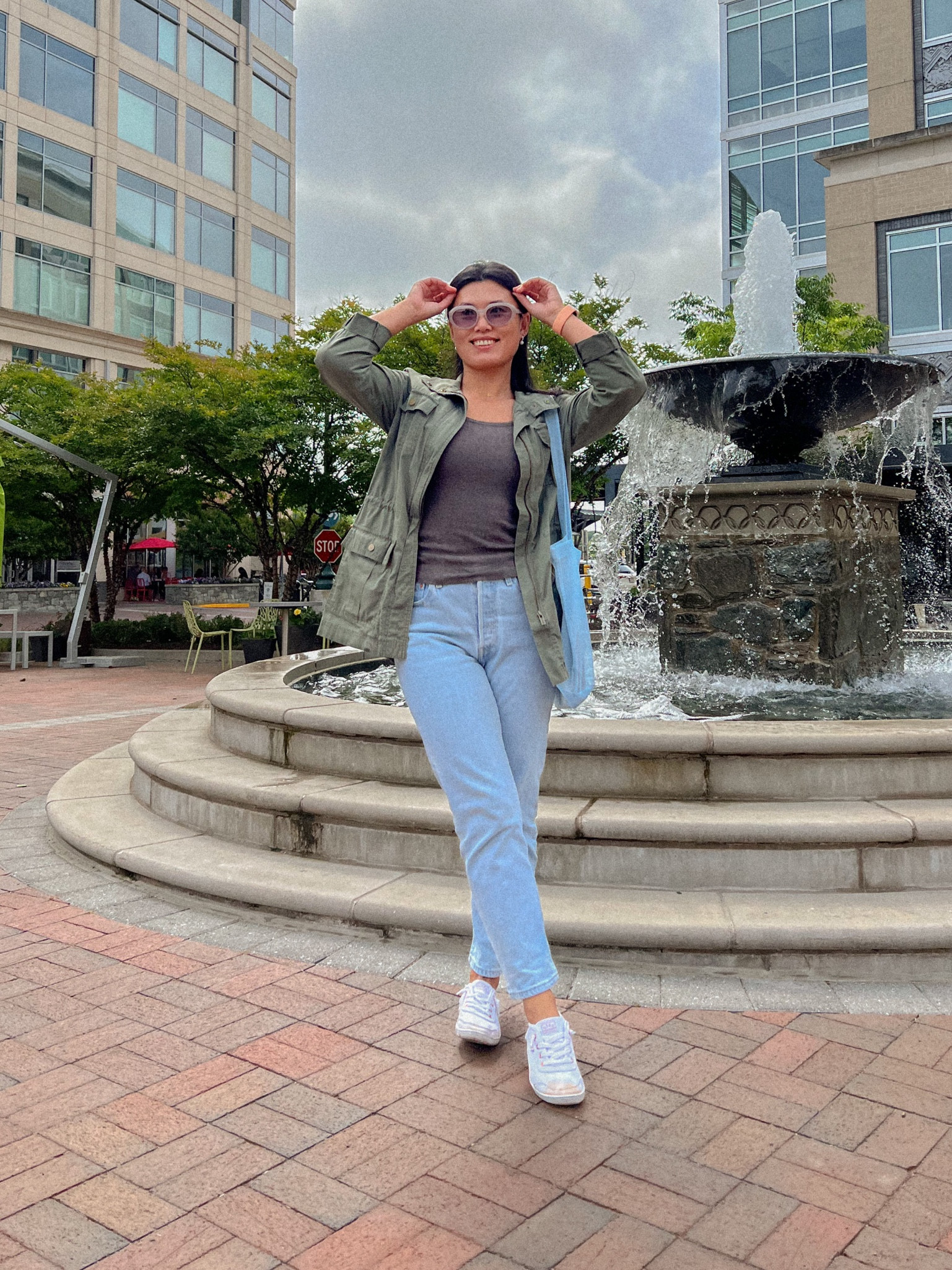 The ensemble strikes a perfect balance between casual chic and comfort, with the light-wash jeans and crisp white sneakers offering a classic, effortless vibe. The structured olive jacket adds an edge and practicality, making it a versatile choice for a variety of occasions.