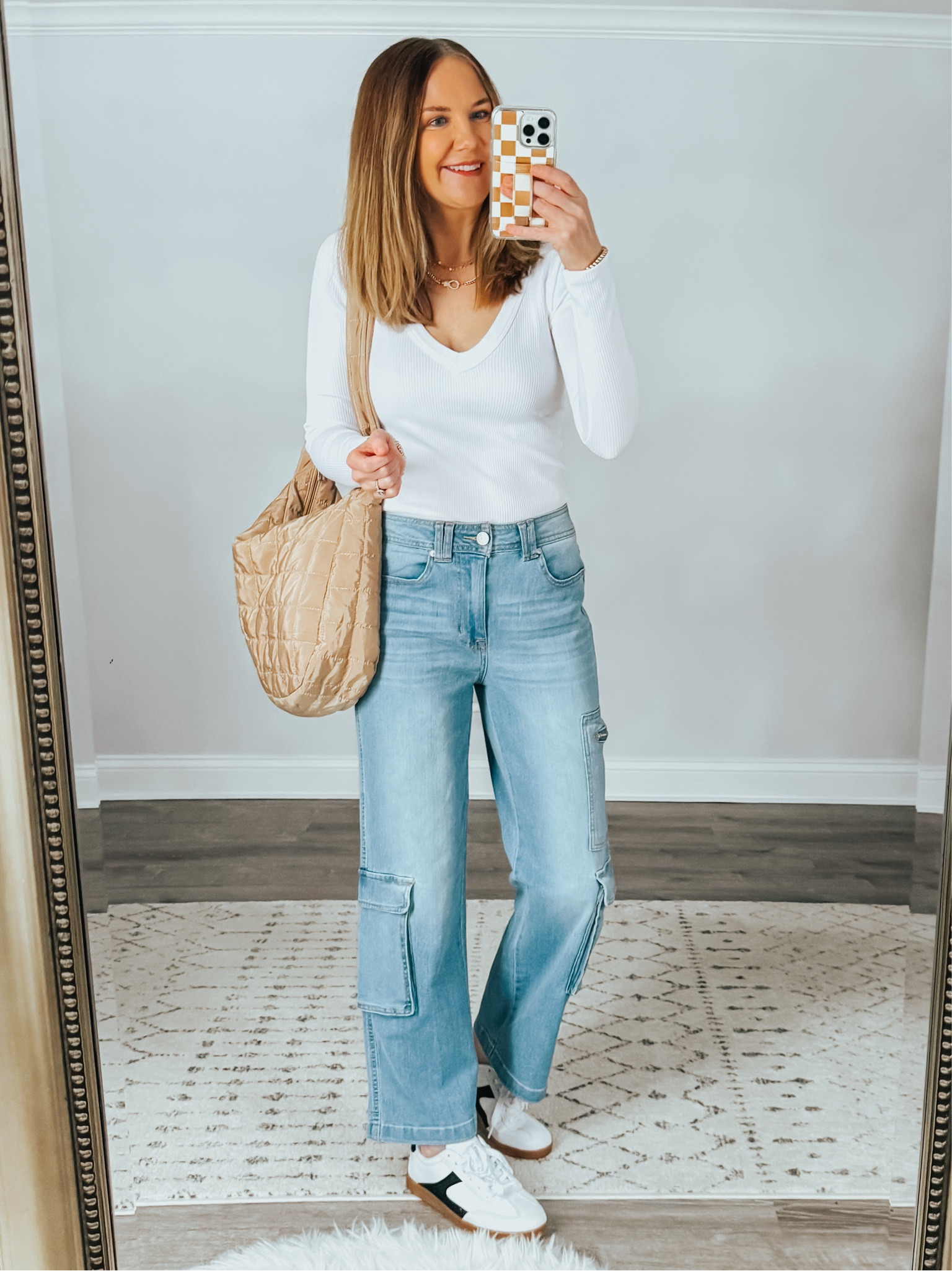 The ensemble strikes a perfect balance of casual chic with its classic white V-neck paired with trendy wide-leg denim, offering both comfort and style. The neutral-toned quilted bag adds a touch of texture and sophistication, complementing the clean lines of the outfit.