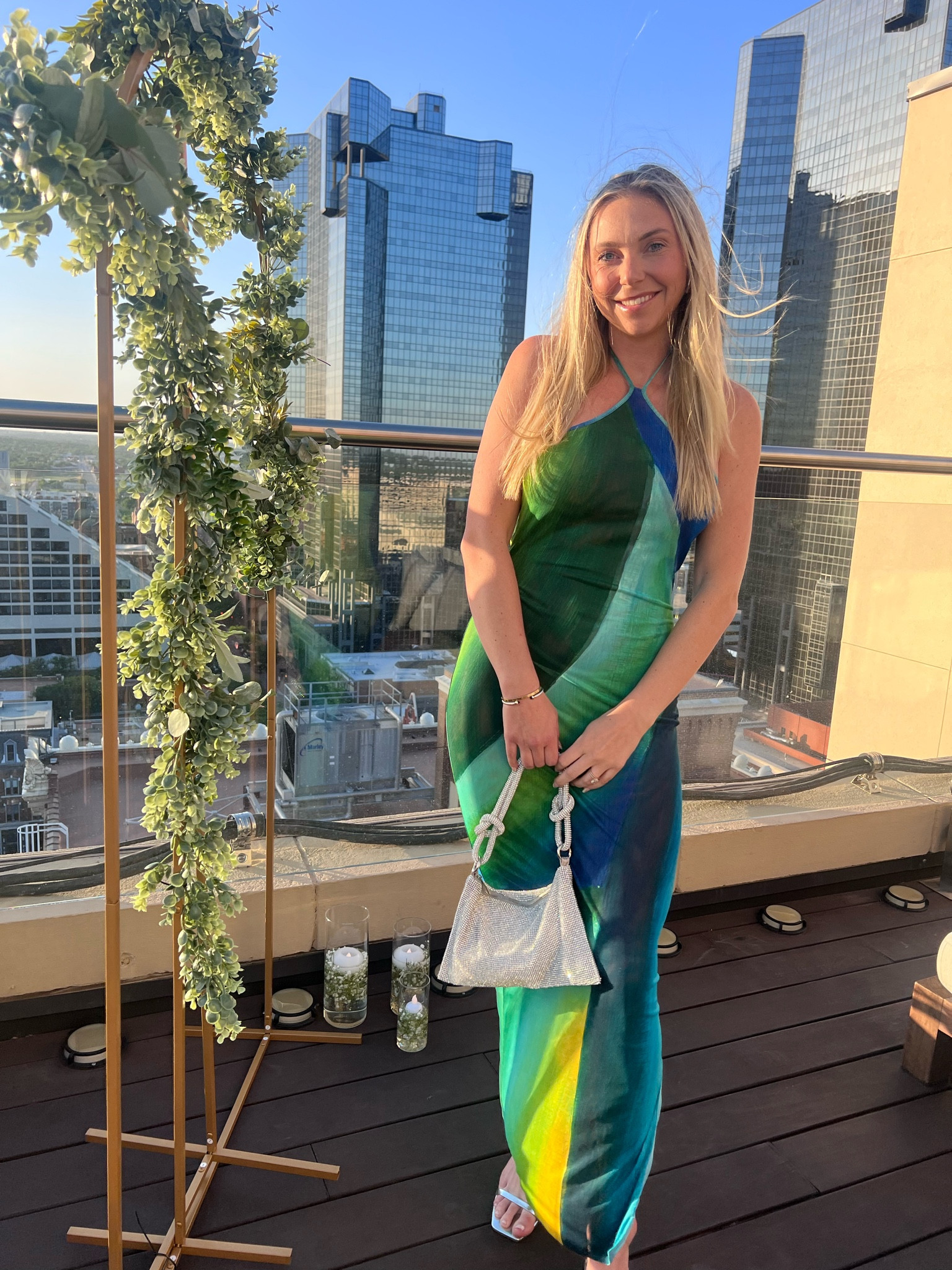 I love how the vibrant green and blue hues of the dress complement the city skyline and her radiant smile. The elegant fit and shimmering purse add a perfect touch of glamour, making this outfit both stunning and sophisticated.