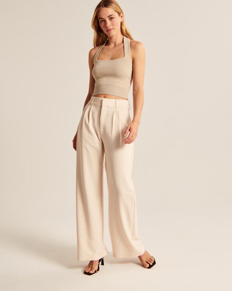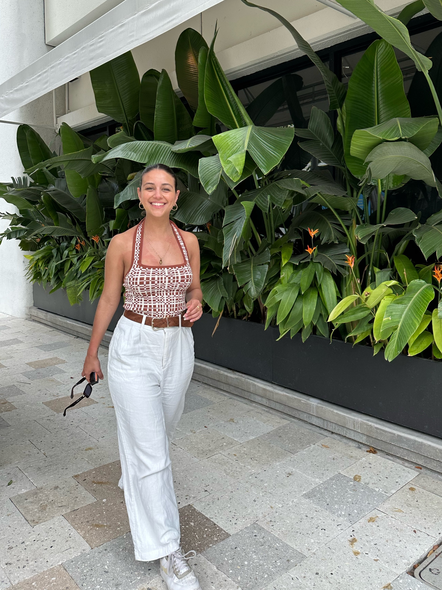 I love how the earthy tones of the checkered halter top perfectly contrast with the crisp, white wide-leg pants, creating a balanced and stylish look. The outfit’s casual yet chic vibe is completed with minimal accessories, making it effortlessly fashionable.