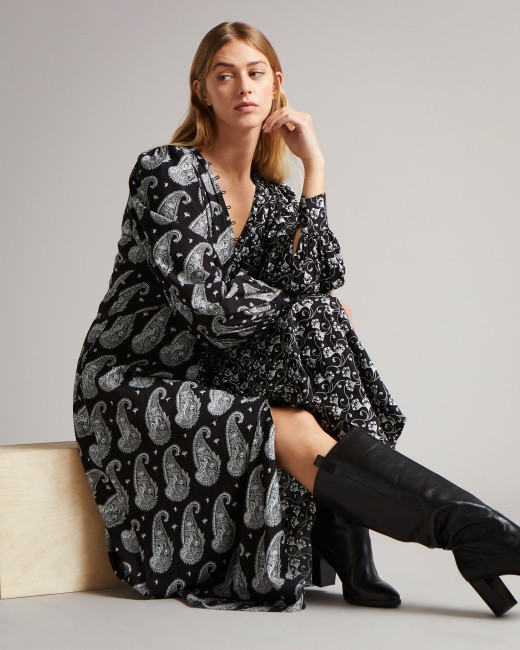 I love how the monochromatic paisley patterns balance sophistication with a hint of bohemian flair, while the ankle boots add a touch of edgy modernity. The overall look feels effortlessly chic and perfectly suited for both casual and semi-formal occasions.