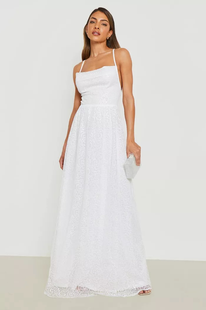 I love how this dress combines a delicate, form-fitting silhouette with elegant, flowy fabric, creating a beautiful balance. The white color enhances its sophistication, making it perfect for a serene, garden setting.