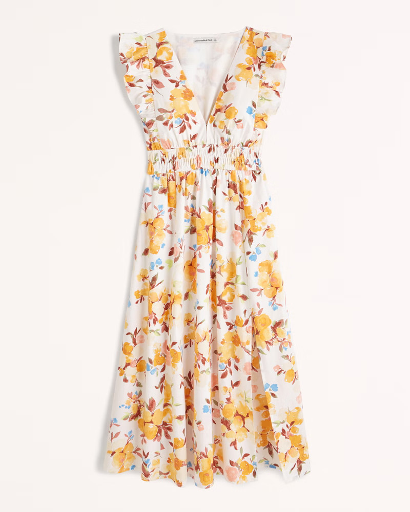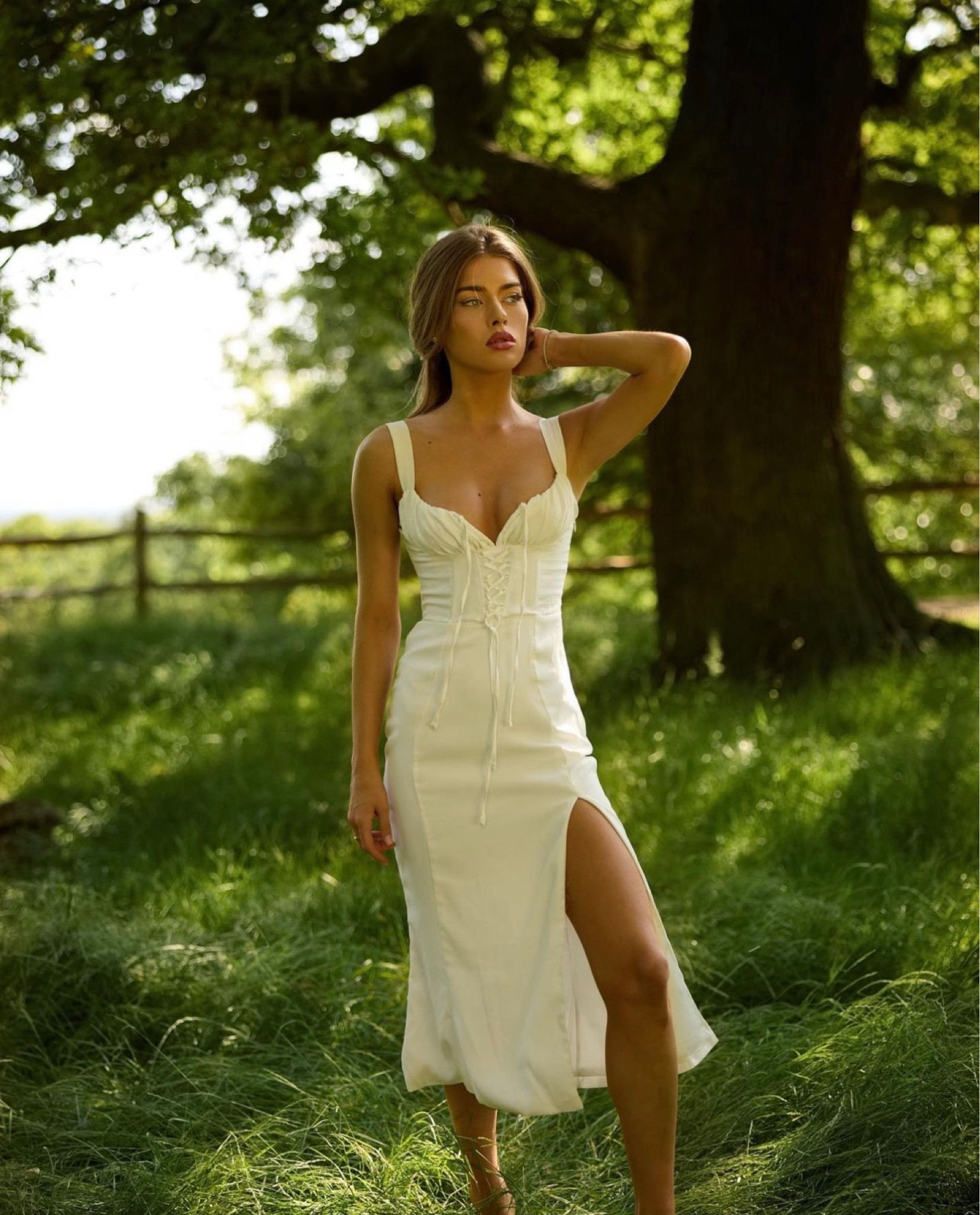 I love how this elegant dress highlights the figure with its tailored bodice and subtle ruffle detailing, while the thigh-high slit adds a touch of sophistication and allure. The fresh, light fabric makes it perfect for a sunlit outdoor setting, blending style with nature effortlessly.
