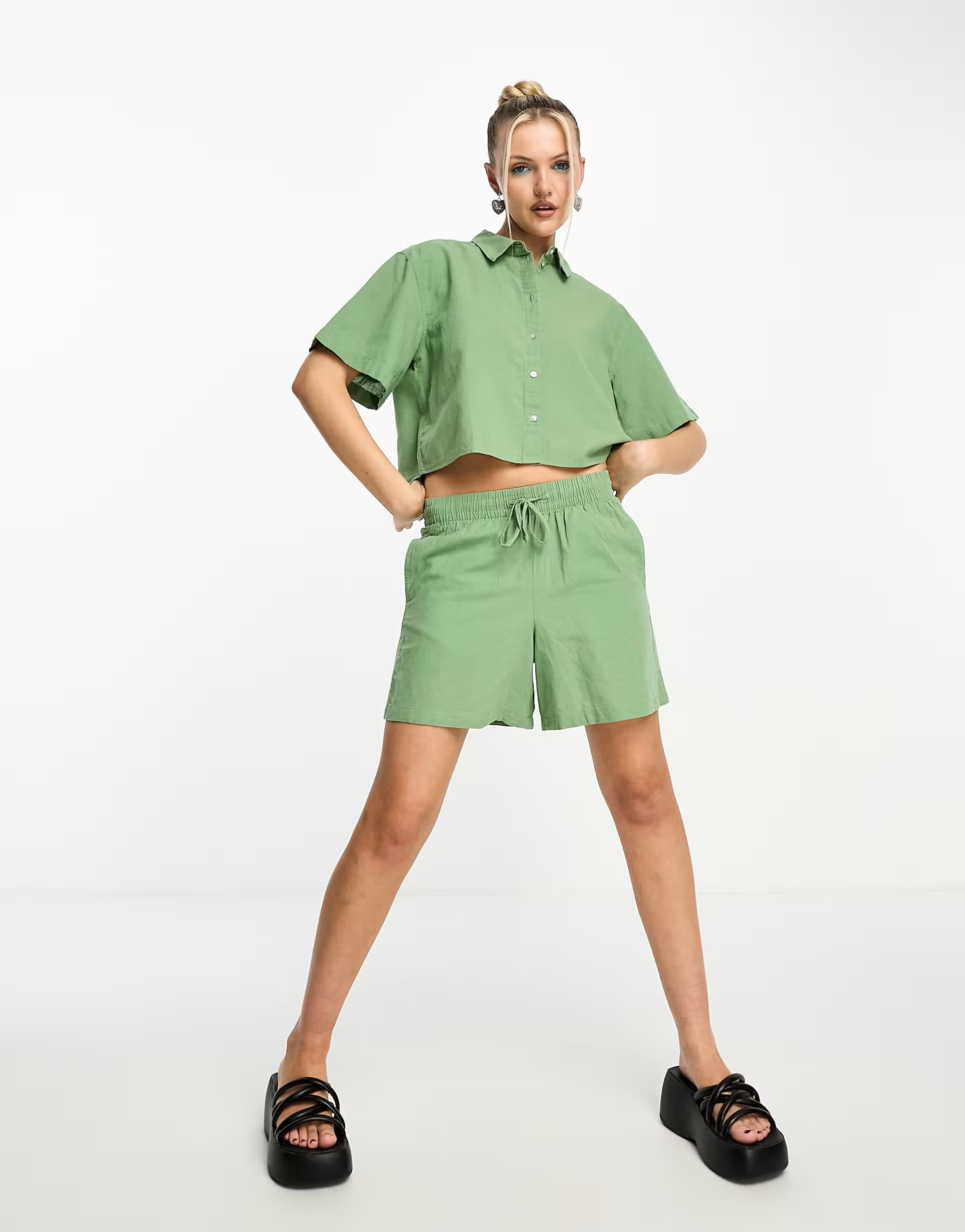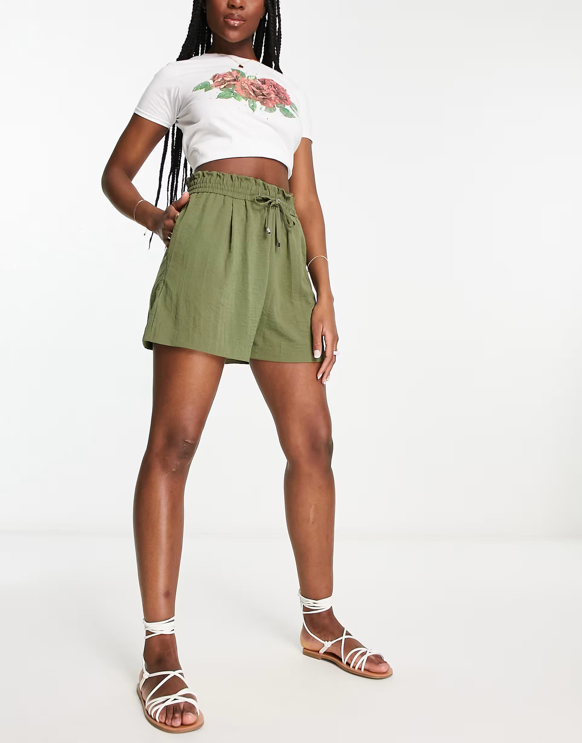 I love how the pastel pink crop top with a front tie perfectly complements the high-waisted white shorts, creating a chic yet carefree summer look. The subtle accessories and relaxed hairstyle add just the right touch of elegance to the casual outfit.