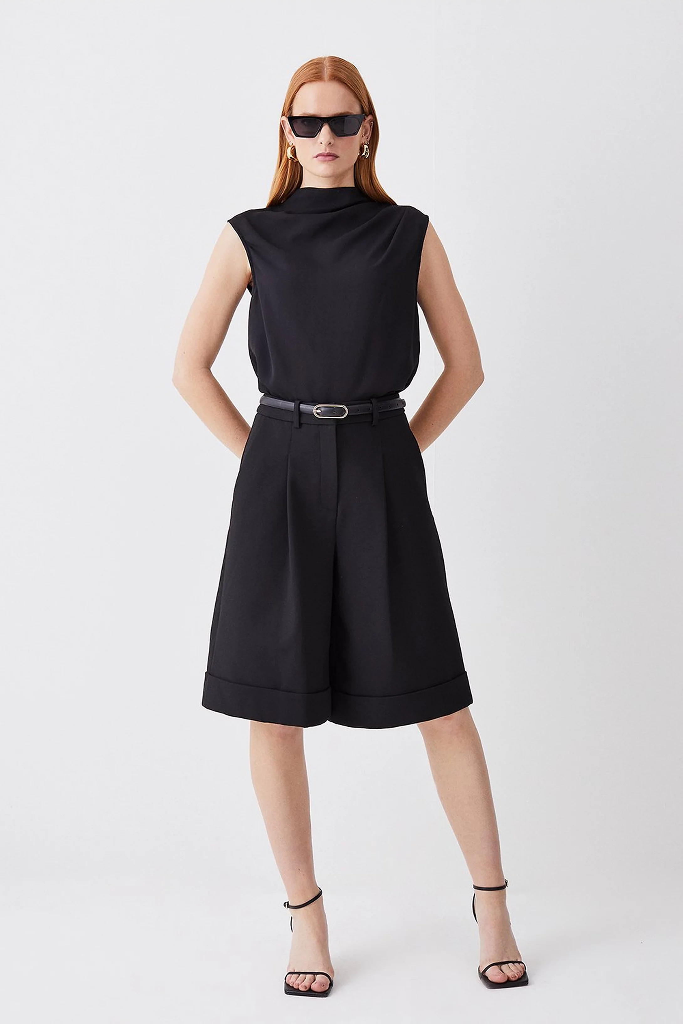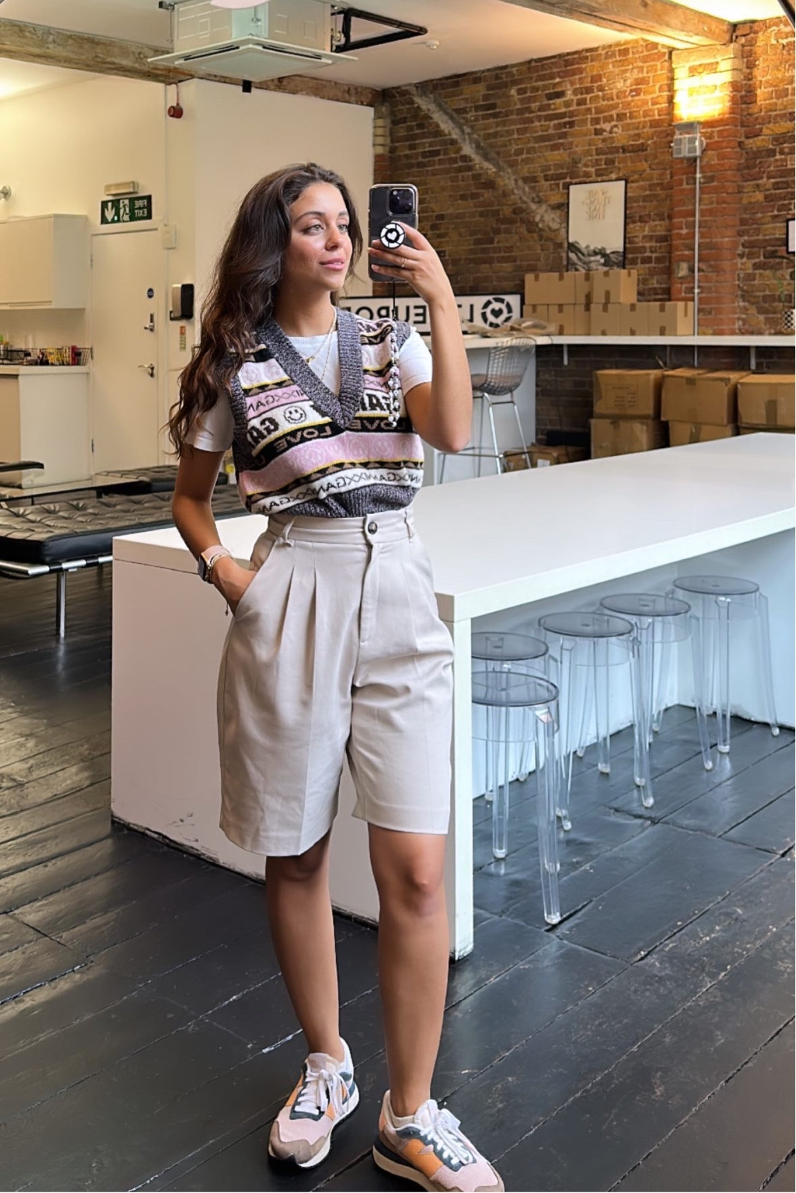 I love how the tailored shorts and knit vest create a chic, yet relaxed look perfect for a stylish office setting. The coordinated colors and comfortable sneakers add a modern touch, making it effortlessly fashionable.
