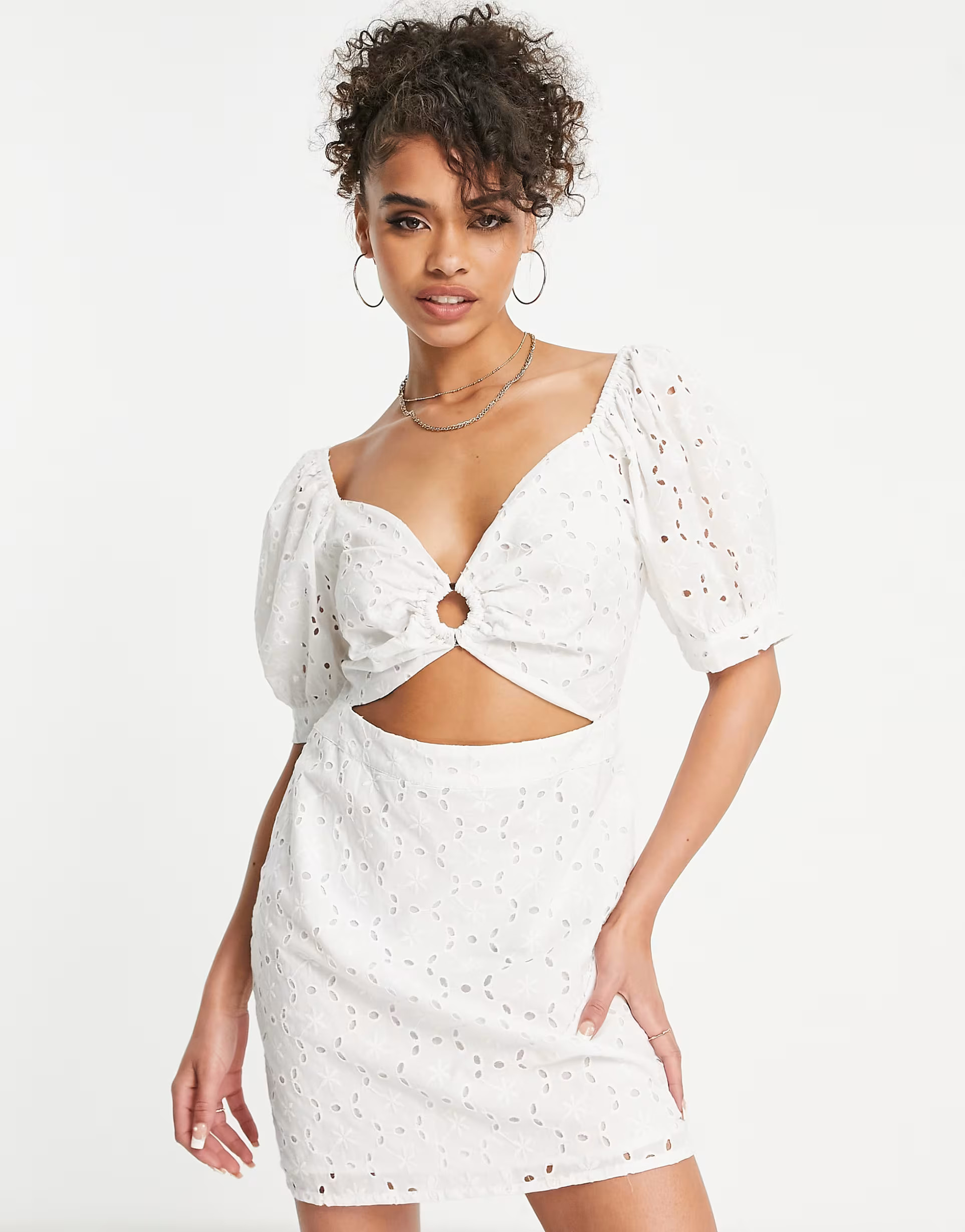 I love the way this textured white dress highlights elegance with a modern twist, especially the chic cut-out detailing that adds a subtle yet stunning flair. The clean lines and tailored fit make it perfect for a sophisticated, polished look.