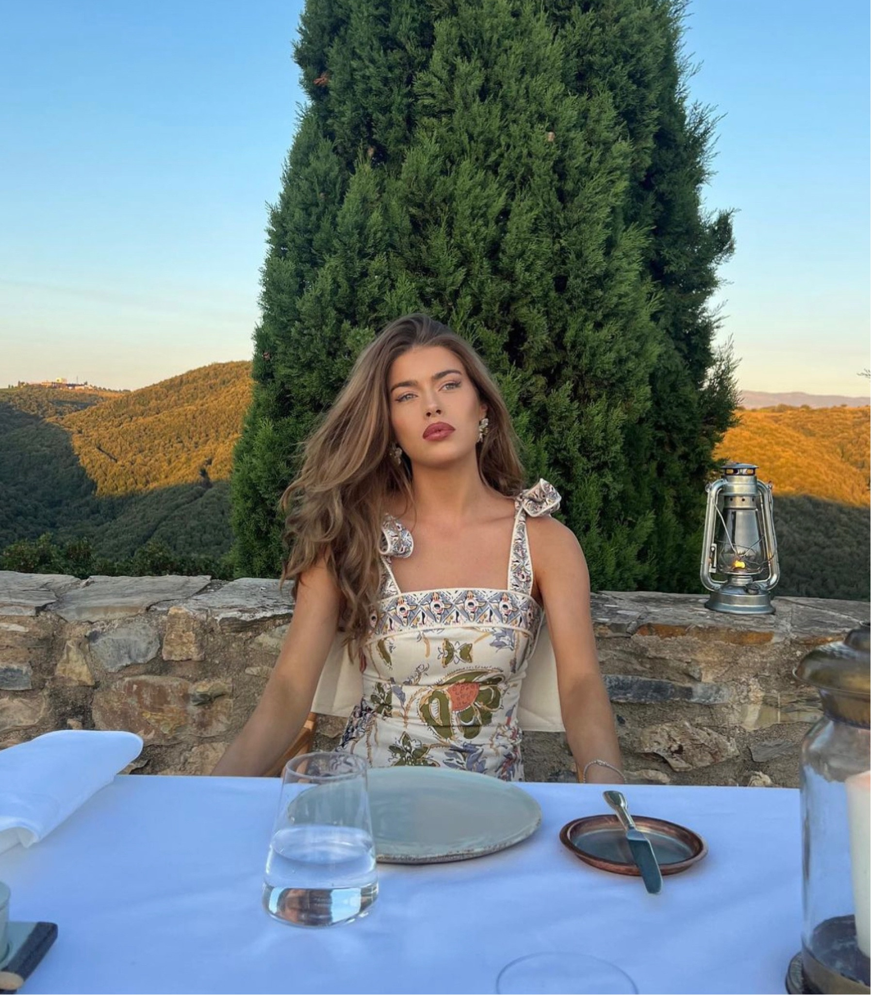 I adore this outfit because the white dress accentuates a fresh, summery vibe, and the flared, ruffled hem adds a playful, feminine touch. Pairing it with natural surroundings enhances the overall ethereal aesthetic.
