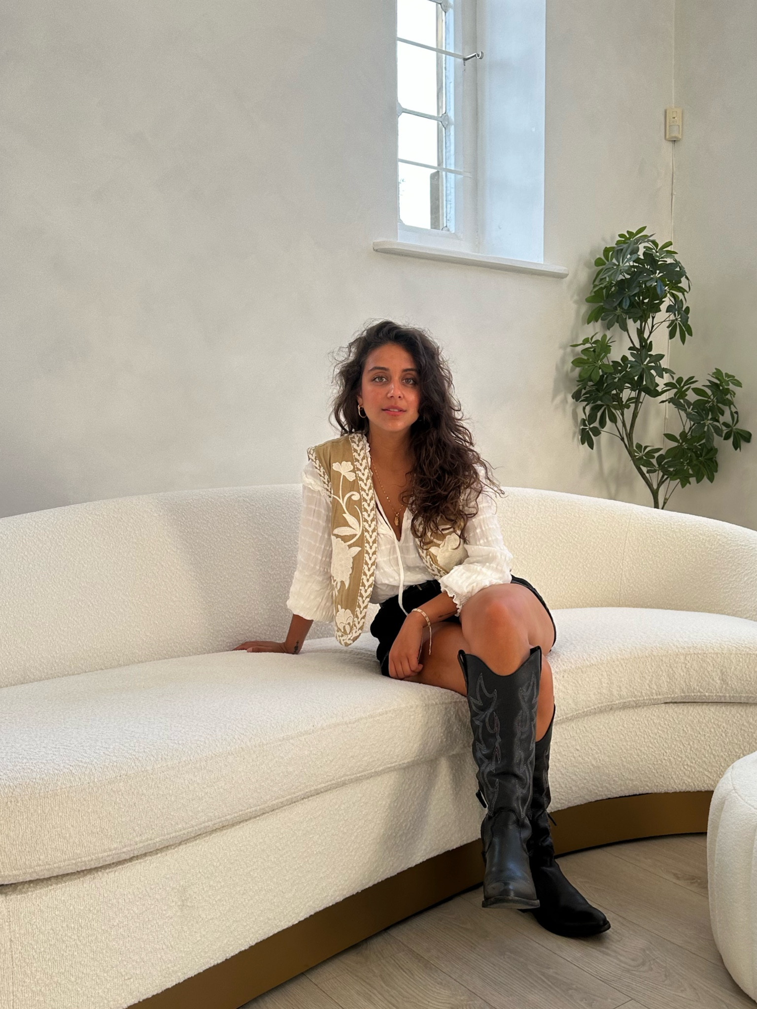 I love how the tailored vest adds a sophisticated touch to the casual white blouse and black shorts, creating a balanced and chic ensemble. The knee-high boots introduce an element of boldness, tying the look together effortlessly.