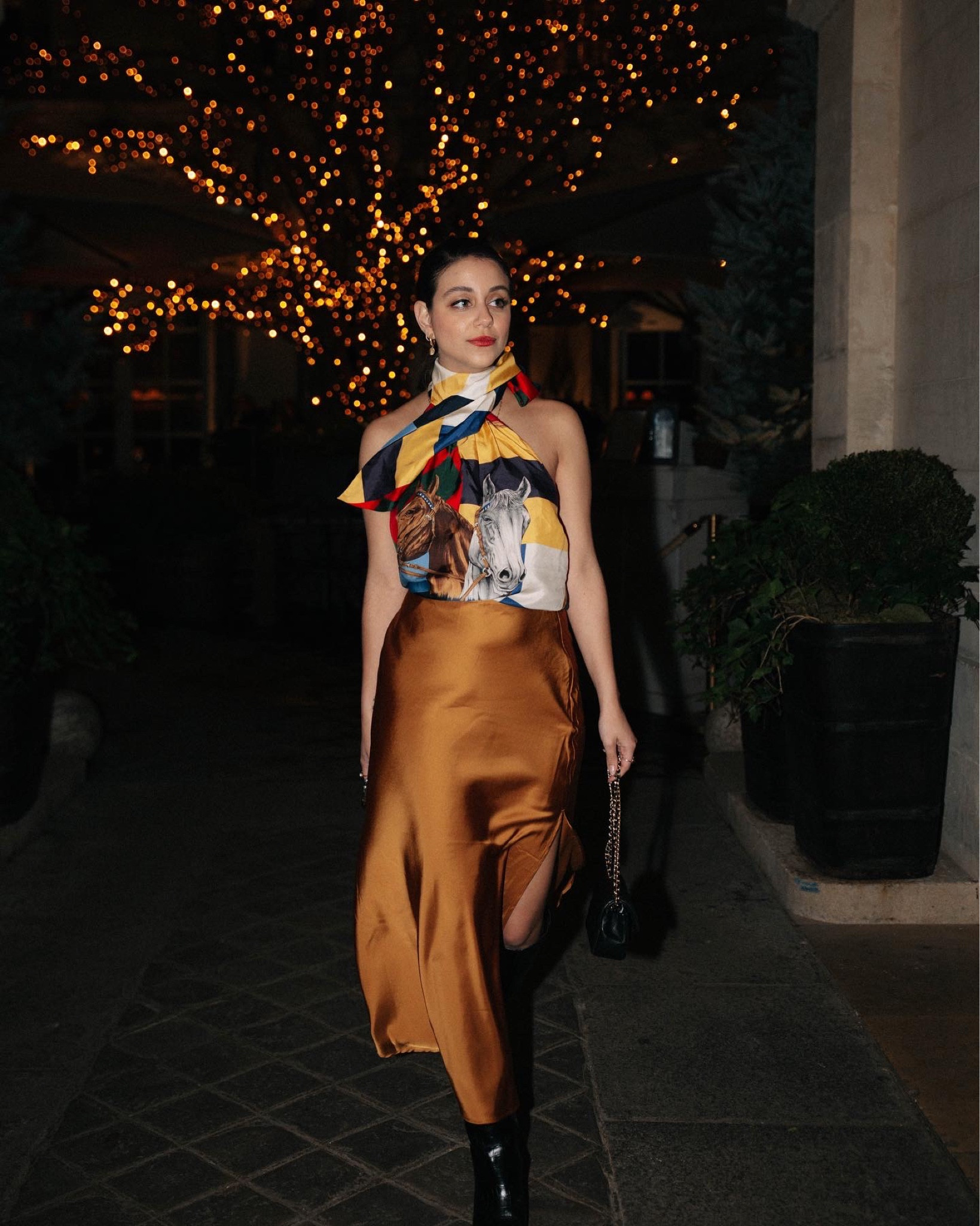 I love how the bold, artistic top perfectly contrasts with the sleek, satin skirt, creating a stunning blend of art and elegance. The outfit’s vibrant colors and textures make it both eye-catching and sophisticated, ideal for a stylish night out.