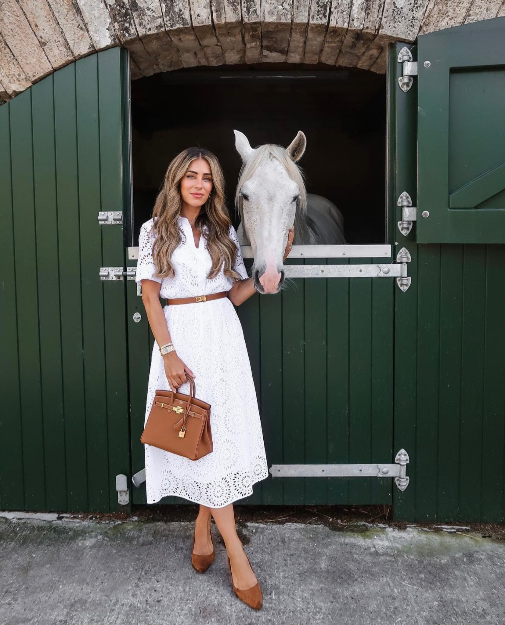 I love how this white, eyelet lace dress provides a fresh, timeless elegance, perfectly complemented by the brown accessories that add a rich, earthy touch. The tan belt, bag, and shoes create a cohesive and effortlessly chic look.