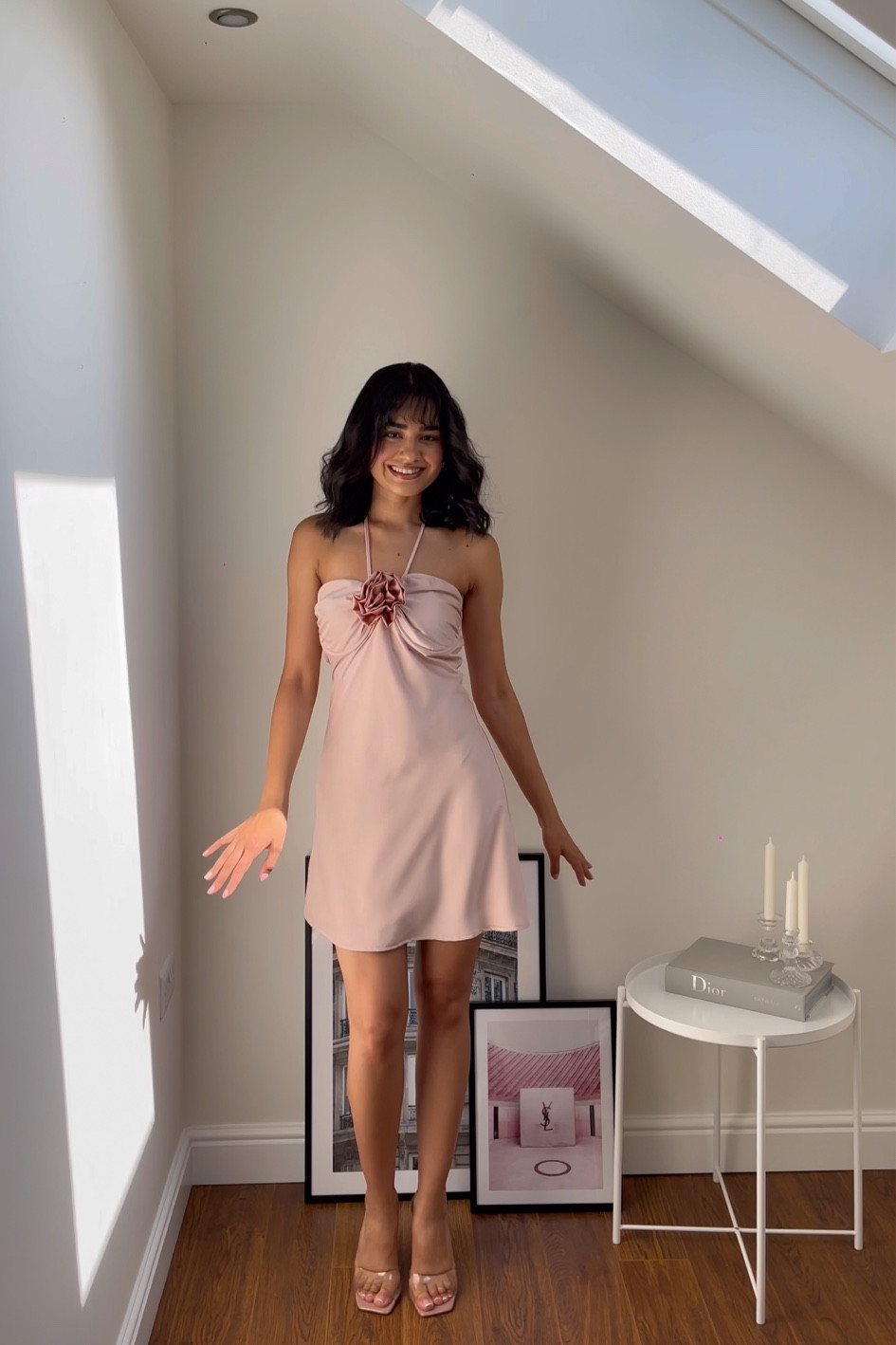 I love this outfit because the soft pink hue creates a charming and delicate look, while the floral detail at the bust adds a playful and feminine touch. The simple silhouette and strappy heels elongate the legs, making it perfect for a chic and effortless style.