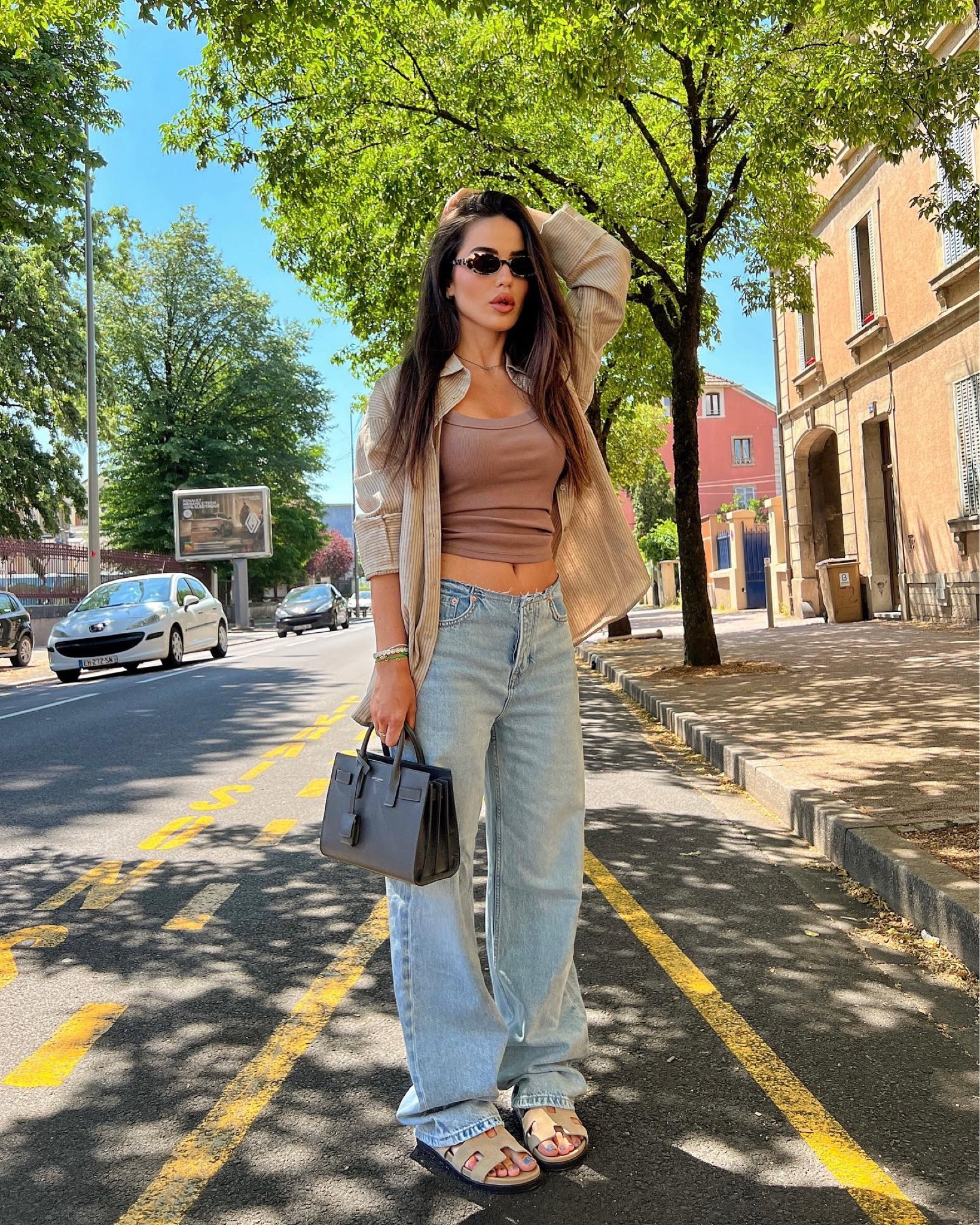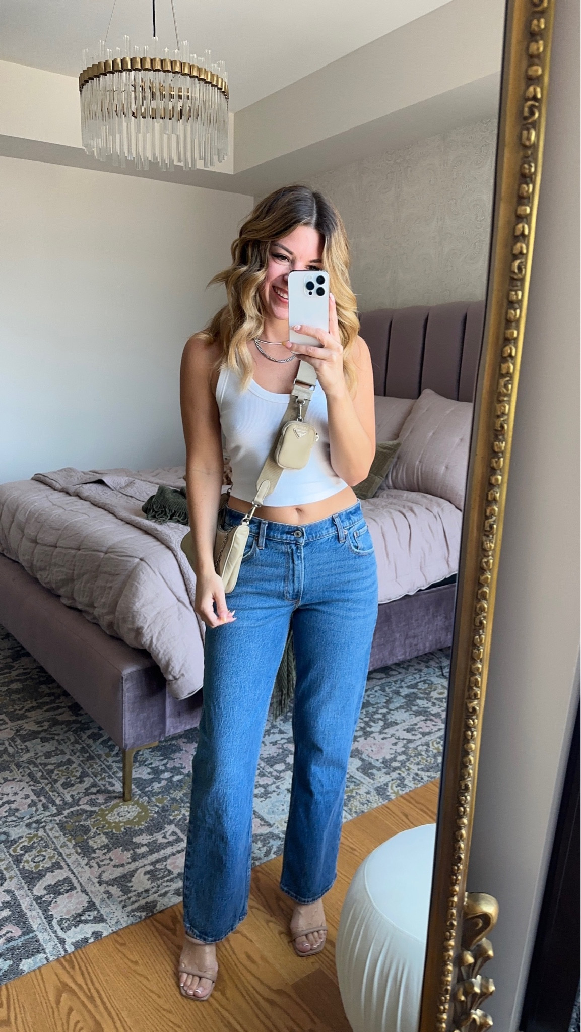 The high-waisted jeans paired with a fitted white tank top create a timeless, chic look that emphasizes the silhouette beautifully. The choice of simple yet elegant accessories, such as the small crossbody bag, adds a polished touch without overwhelming the ensemble.