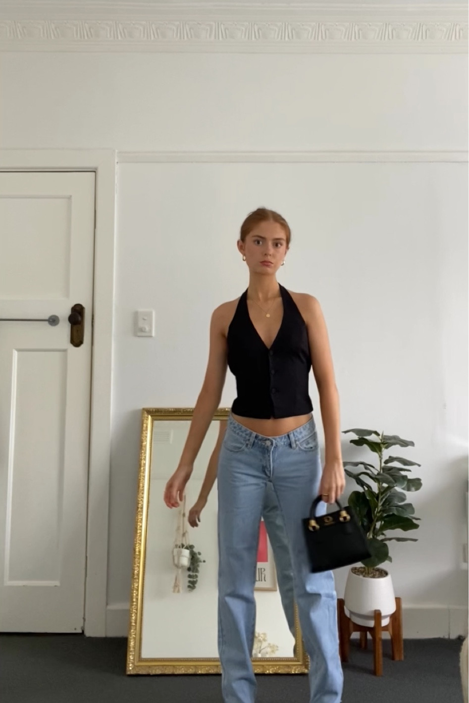 The minimalist approach of pairing a classic black top with timeless high-waisted jeans creates a chic and effortlessly elegant look. The outfit’s streamlined silhouette is both on-trend and versatile, perfect for a range of occasions.