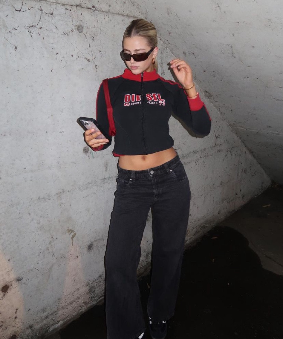 The cropped athletic-inspired top paired with high-waisted wide-leg trousers creates a chic and balanced silhouette, while accessorizing with sleek sunglasses adds a polished touch that elevates the entire ensemble. The contrast between the snug fit of the top and the relaxed fit of the pants offers a modern interpretation of streetwear that’s both stylish and comfortable.