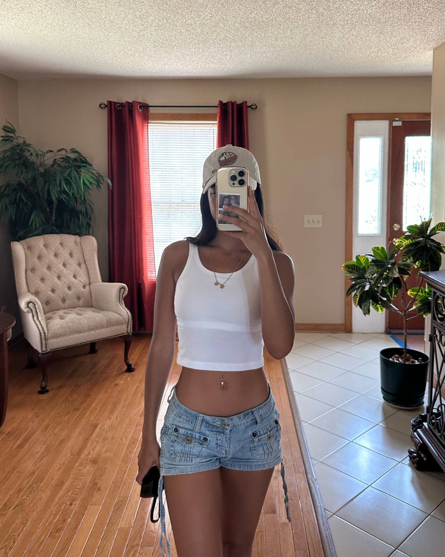 As a fashion expert, I appreciate how the simplicity of the white cropped tank top pairs effortlessly with the distressed denim shorts, creating an easy, casual, yet stylish summer look. The addition of the cap and layered necklace adds a personal touch, giving the outfit a sense of cool, laid-back charm.