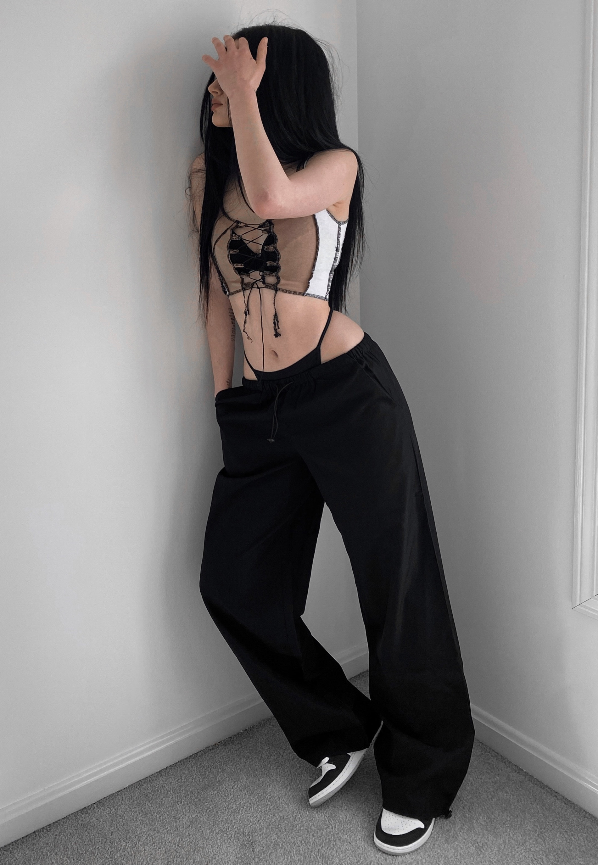 The juxtaposition of the intricate lace-up detailing on the top with the relaxed fit of the high-waisted black trousers creates a dynamic and edgy look. The monochromatic palette is timeless, while the exposed midriff adds a daring touch of modernity.