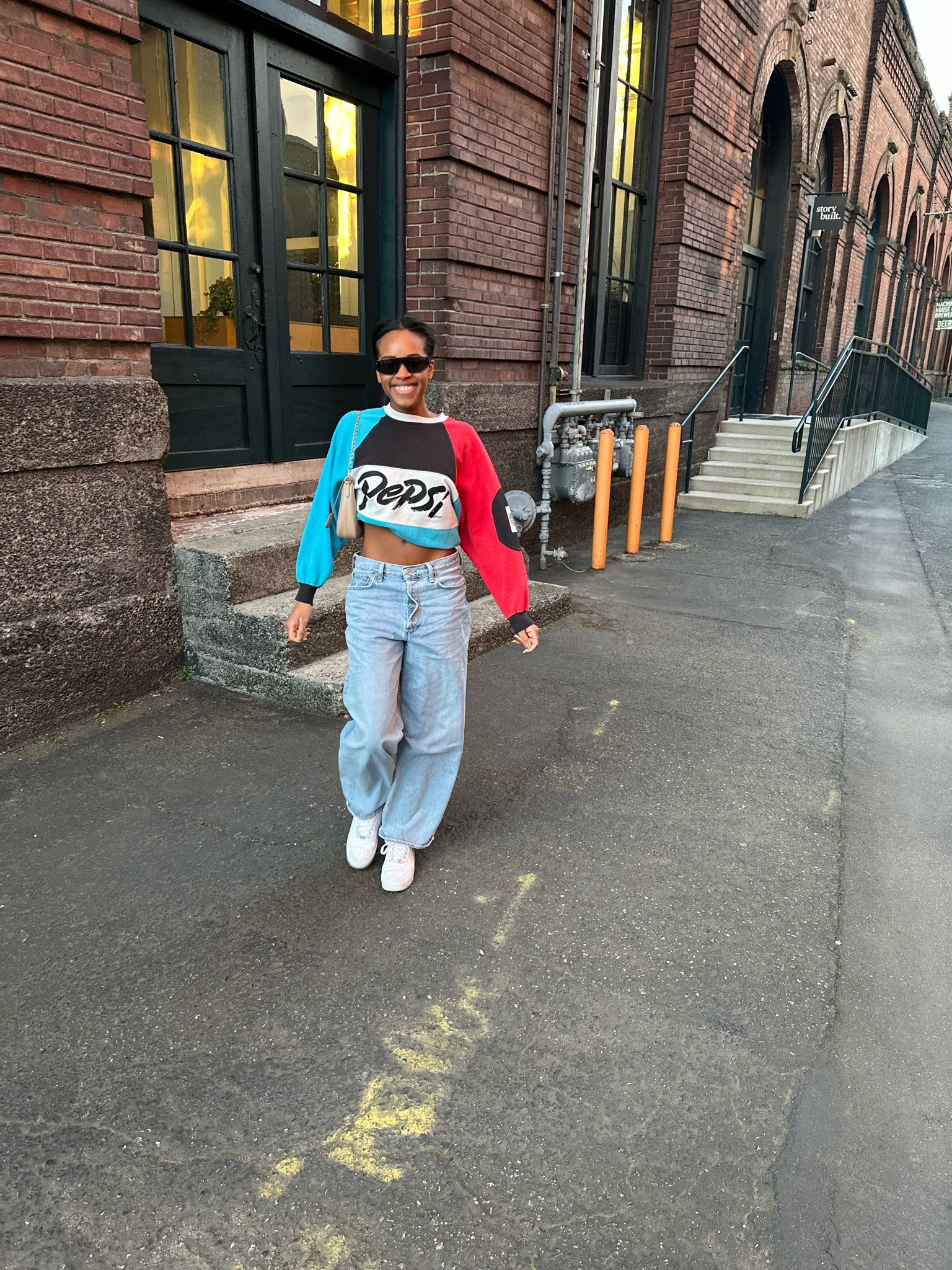 The outfit masterfully combines comfort with a pop of color, showcasing a relaxed yet stylish vibe with its oversized jeans and graphic tee. The ensemble is balanced by a classic pair of white sneakers, marrying effortless chic with streetwear cool.