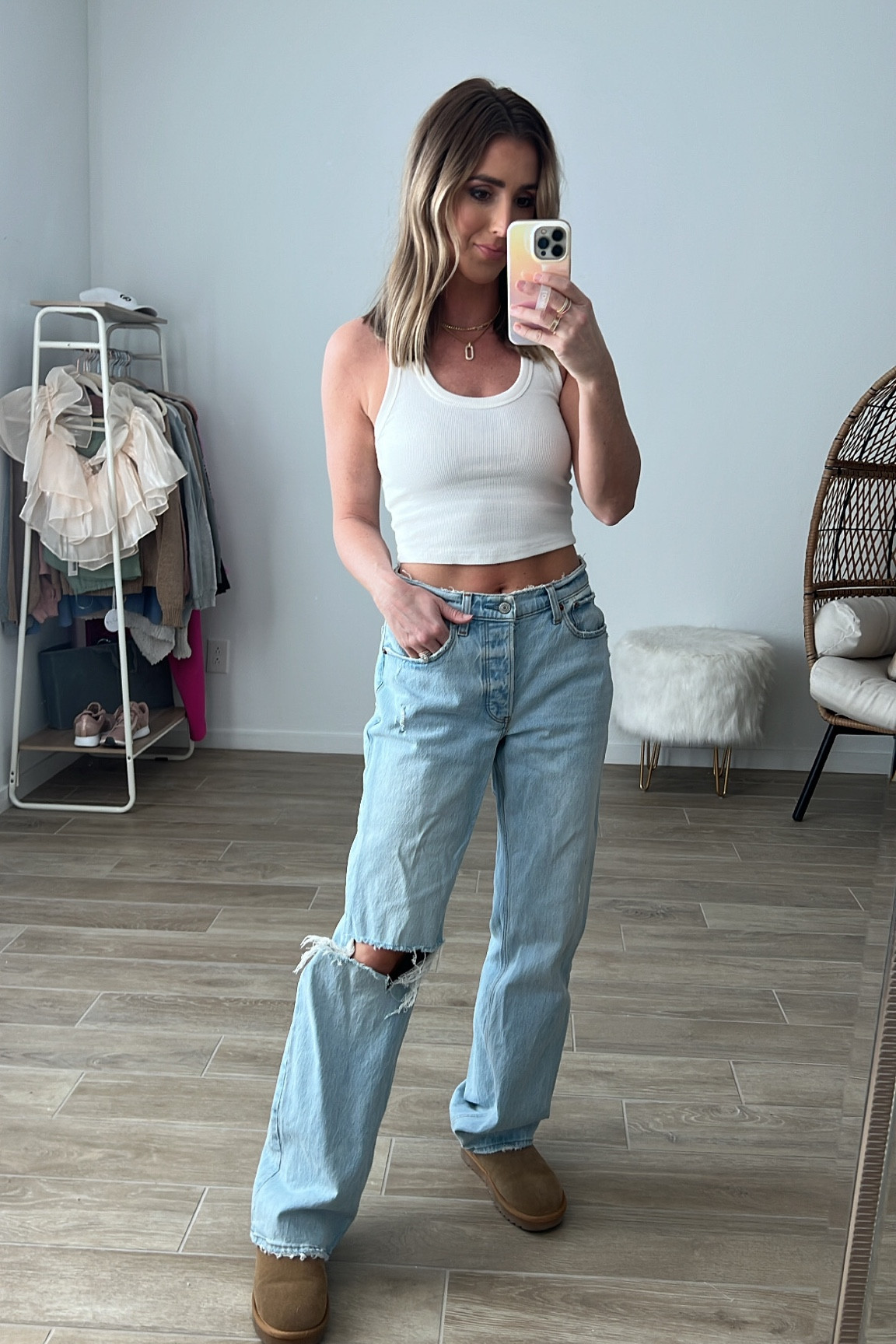 The high-waisted, light-washed jeans offer a relaxed yet trendy silhouette, complementing the fitted white crop top, which neatly balances the proportions. The outfit’s casual chic vibe is effortlessly finalized by the cozy footwear, adding a touch of accessible style.