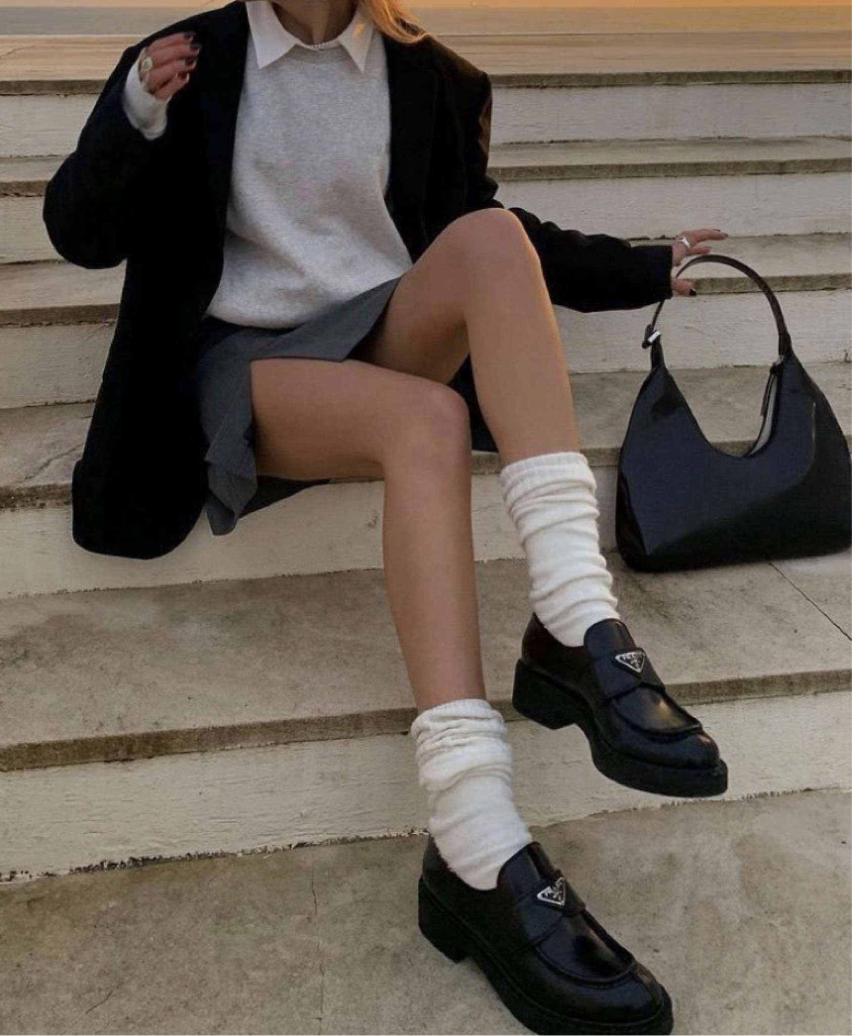 The ensemble presents a chic, balanced blend of casual and smart by pairing a classic grey sweatshirt with a crisp white collar and a tailored black blazer. The chunky loafers with white socks add a trendy, youthful edge, while the simple black handbag ties the look together with a sophisticated finish.