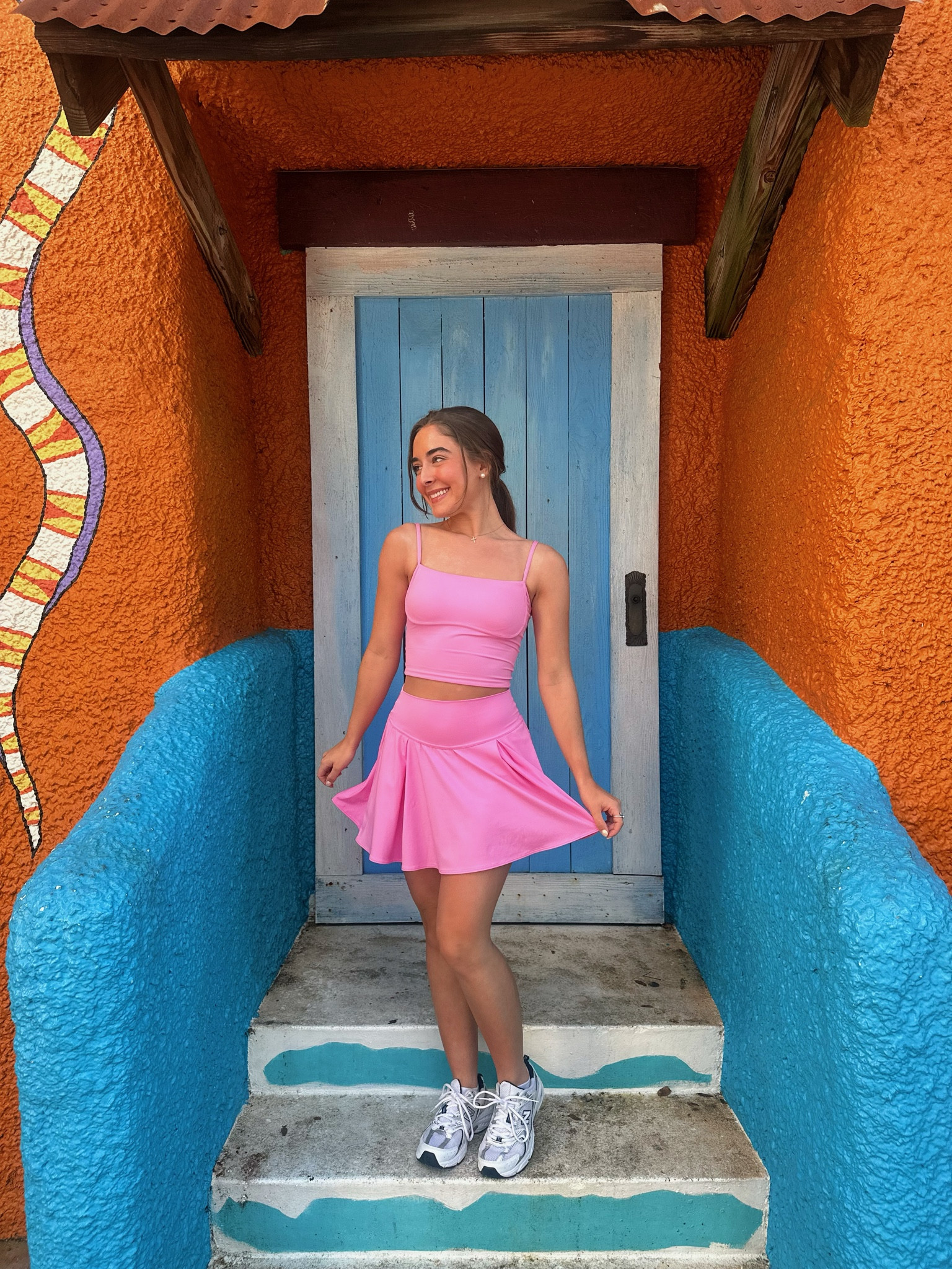 The vibrant pink tones of the outfit beautifully contrast with the vivid orange and blue background, creating a vivacious and eye-catching look. The flirty skirt paired with casual sneakers strikes a perfect balance between stylish and comfortable, making it an excellent choice for a playful, yet fashion-forward ensemble.
