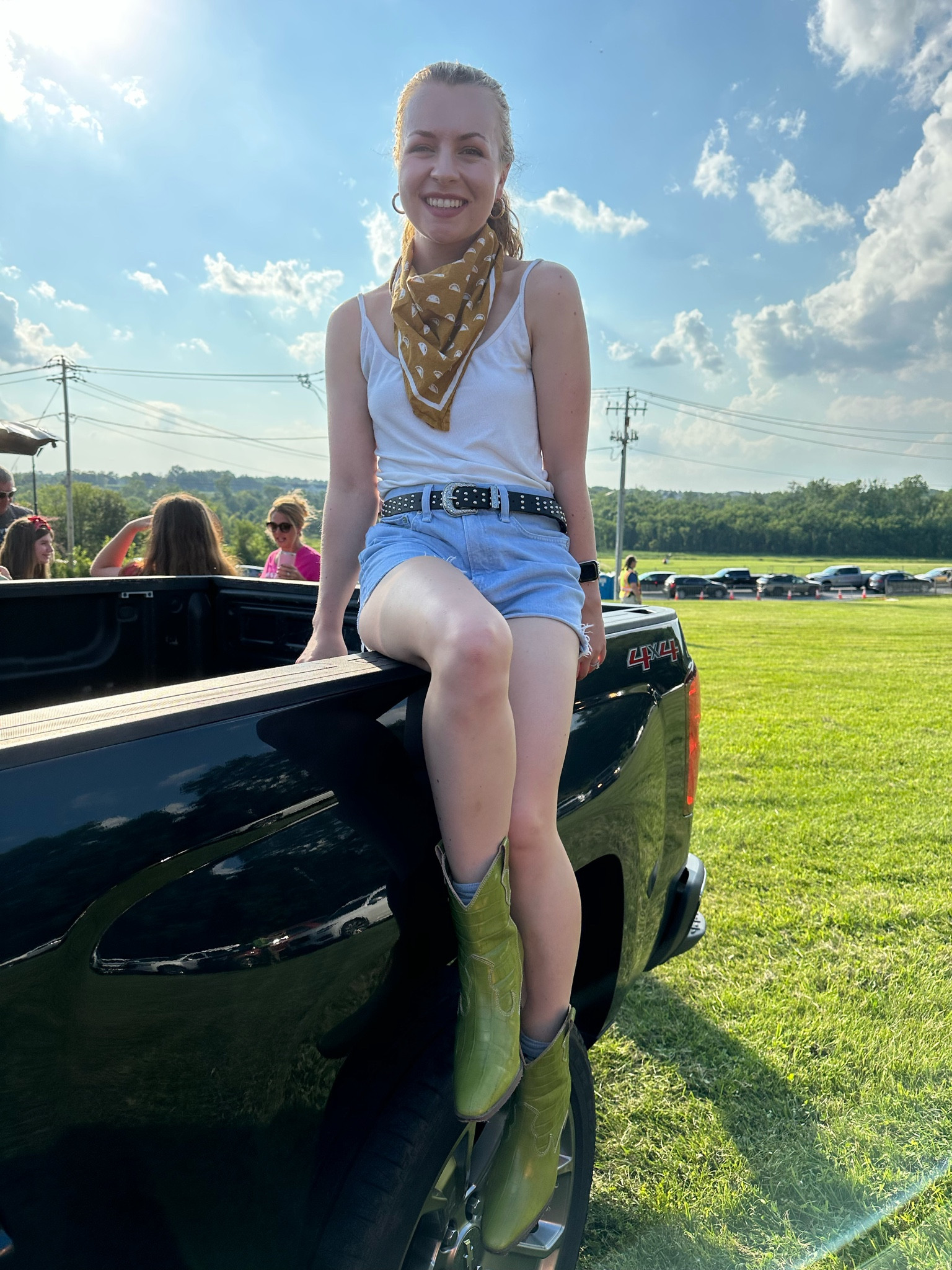 The ensemble exudes a carefree and adventurous spirit, blending casual chic with a dash of Western flair. The vivid green cowboy boots and patterned scarf add a playful pop of color and texture, perfectly accentuating the simple white dress and denim belt for a balanced, eye-catching look.