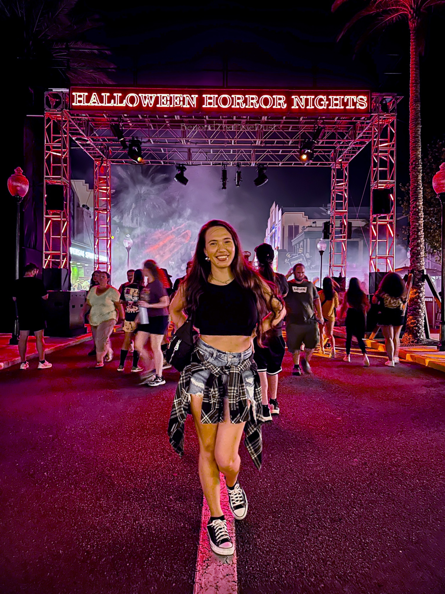 The all-black ensemble with the contrast of the plaid shirt tied around the waist offers a classic, edgy look that’s perfect for a fun night out. The combination of the fitted top and sneakers strikes a stylish yet comfortable balance suitable for an event-packed evening.