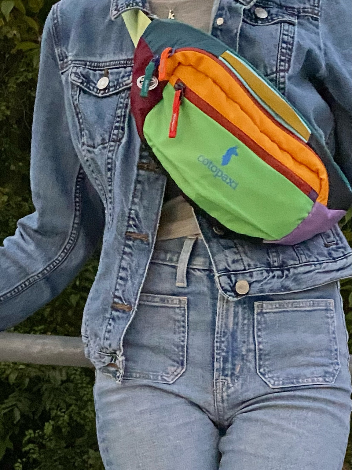 The denim-on-denim ensemble creates a timeless, cohesive look, while the colorful waist bag adds a playful and contemporary pop of color that captures attention and breaks the monochrome scheme. The mix of casual textures with a bright accessory makes for a stylish yet functional streetwear aesthetic.