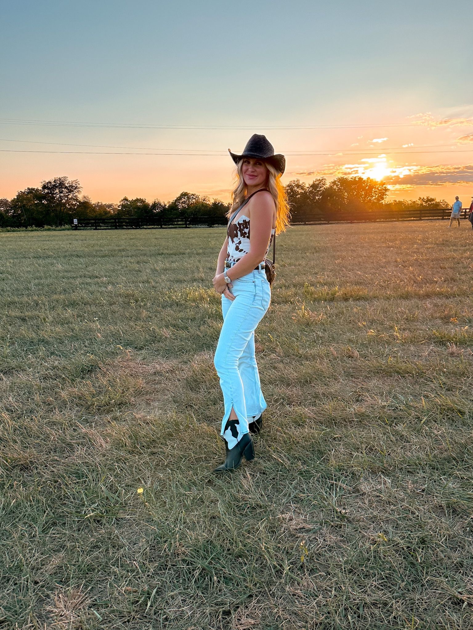 The cow print on the crop top brings a playful and bold statement to the outfit, effortlessly complementing the high-waisted, distressed jeans which add a rugged, chic edge that’s perfect for casual outings. The outfit strikes a charming balance between countryside whimsy and contemporary street style.