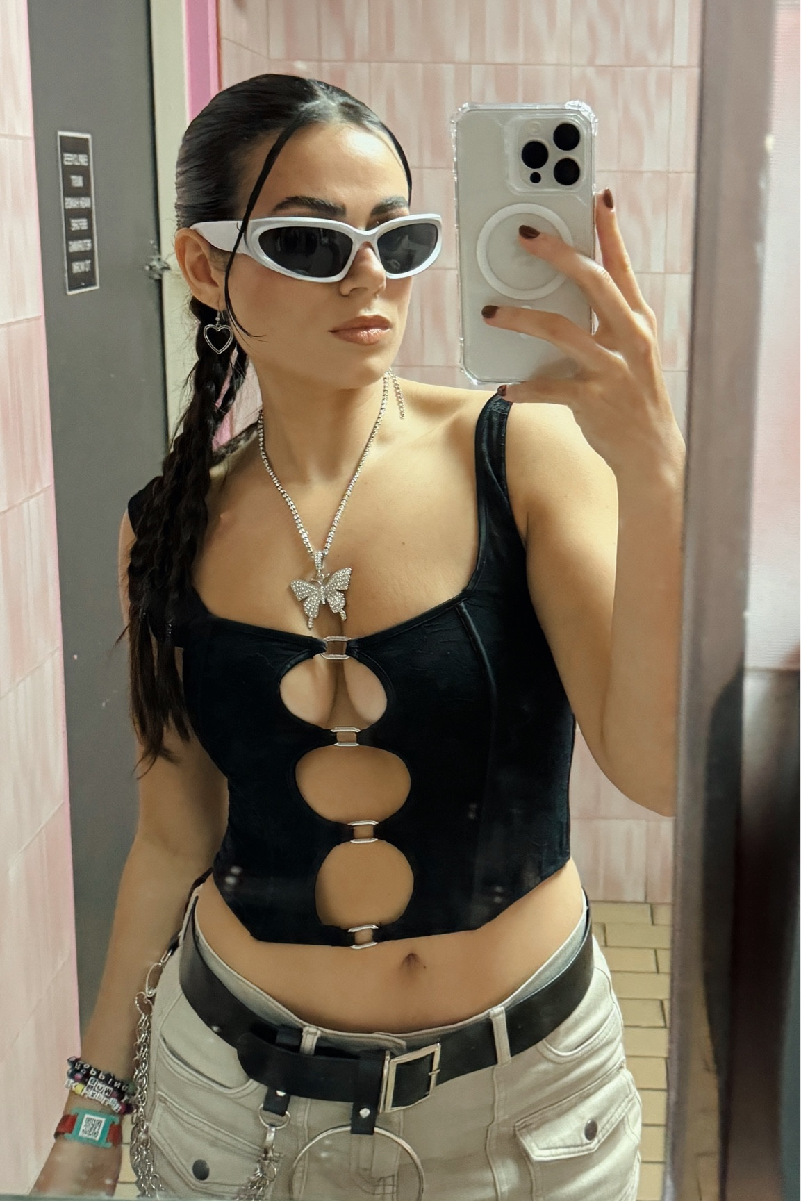 The outfit presents a bold and contemporary aesthetic with its cut-out top that adds a daring touch; the monochromatic palette creates a sleek and stylish look, complemented by statement accessories like the sunglasses and necklace. The balance between edge and simplicity makes it stand out.